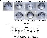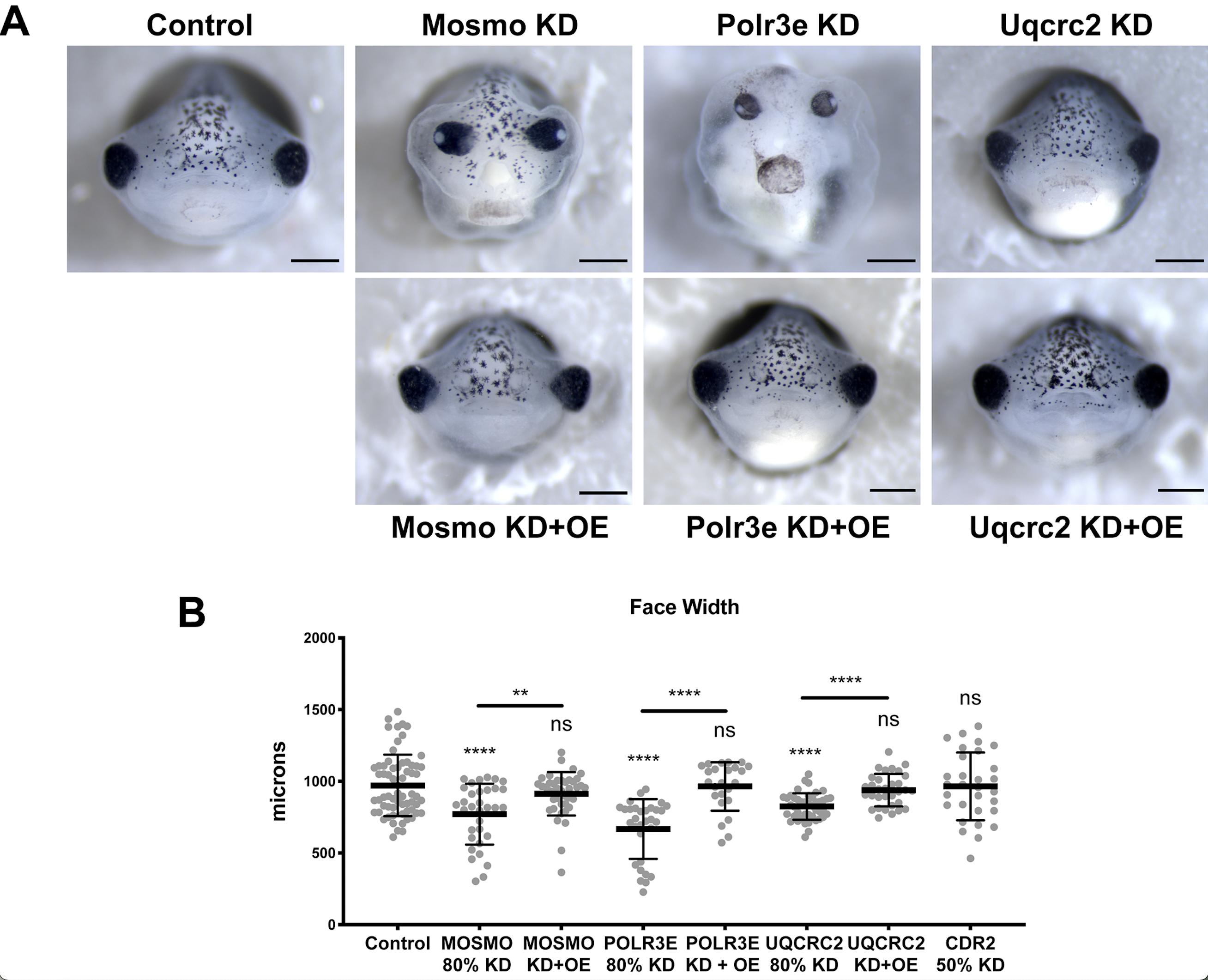 Figure S2. Craniofacial defects caused by 16p12.1-associated gene KD are rescued by co- injection of exogenous mRNA co-expression. (A) Row 1: Representative frontal view images of st. 42 tadpoles injected with control MO or MOs for 16p12.1 homologs show defects in craniofacial features, including a decrease in facial width compared to the control. Row 2: Representative frontal view images of st. 42 tadpoles show facial width defects were rescued with co-injection and overexpression of mRNA for each 16p12.1 gene homolog, respectively. (B) Boxplot representing the quantification and comparison of facial width measurements with knockdown and overexpression of mRNA of individual 16p12.1 gene homologs normalized to controls. Significance determined using a studentâs unpaired t-test. (Embryos quantified: Control = 65, Polr3e KD = 31, Polr3e KD+OE = 24, Mosmo KD = 33, Mosmo KD+OE = 42, Uqcrc2 KD = 44, Uqcrc2 KD+OE = 32, Cdr2 KD = 30). ****p < 0.0001, ***p < 0.001, **p < 0.01, *p < 0.05, n.s., not significant. Scalebar = 500μm.