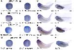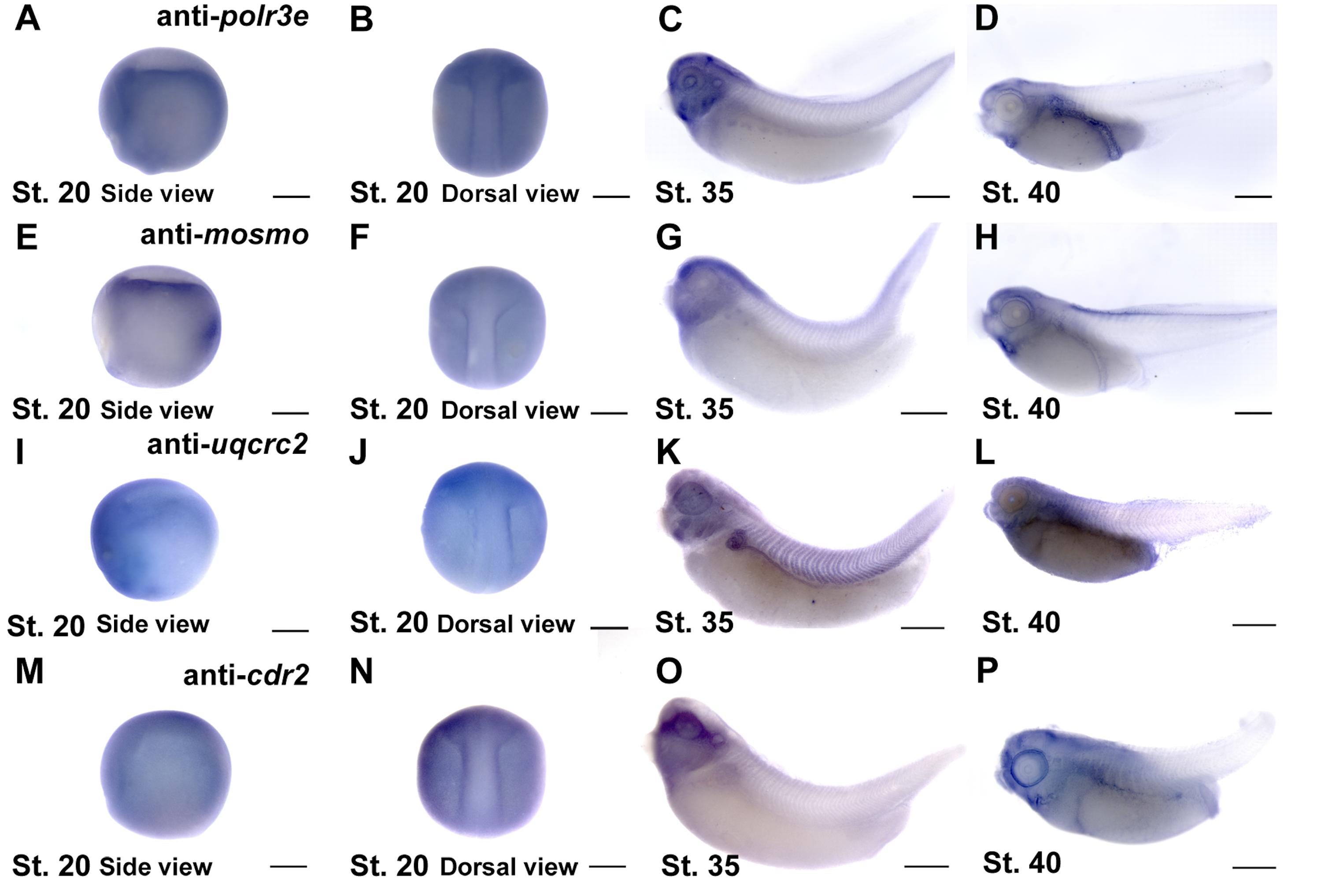 Figure S3: Expression patterns for 16p12.1-affected genes across early development. In situ hybridization utilized (A-D) antisense mRNA probe to polr3e, (E-H) antisense mRNA probe to mosmo, (I-L) antisense mRNA probe to uqcrc2, and (M-P) antisense mRNA probe to cdr2. Anterior to the left. Lateral and dorsal view images of embryos shown at stage 20 (A-B, E-F, I- J, M-N), lateral view at stage 35 (C, G, K, O), and lateral view at stage 40 (D, H, L, P) (n = 10 per probe) Scalebar = 300μm.