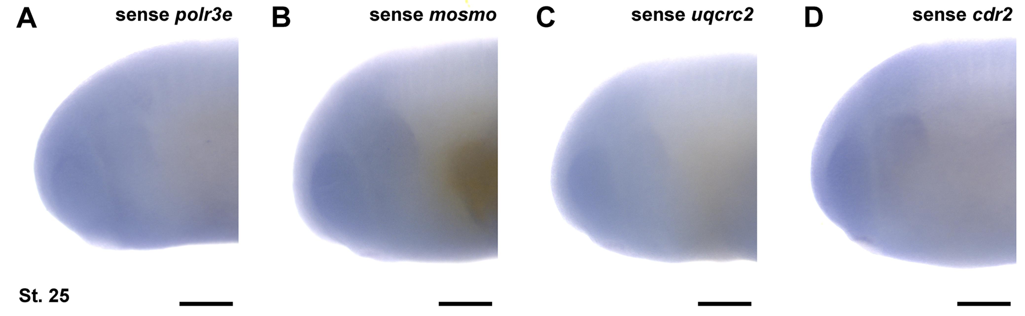 Figure S4: In situ hybridization probes generated against sense strands of 16p12.1-affected gene mRNAs. In situ hybridization utilized (A) sense mRNA probe against polr3e, (B) sense mRNA probe against mosmo, (C) sense mRNA probe against uqcrc2, and (D) sense mRNA probe against cdr2, shown at stage 25. (n = 10 per probe). Scalebar = 300μm.
