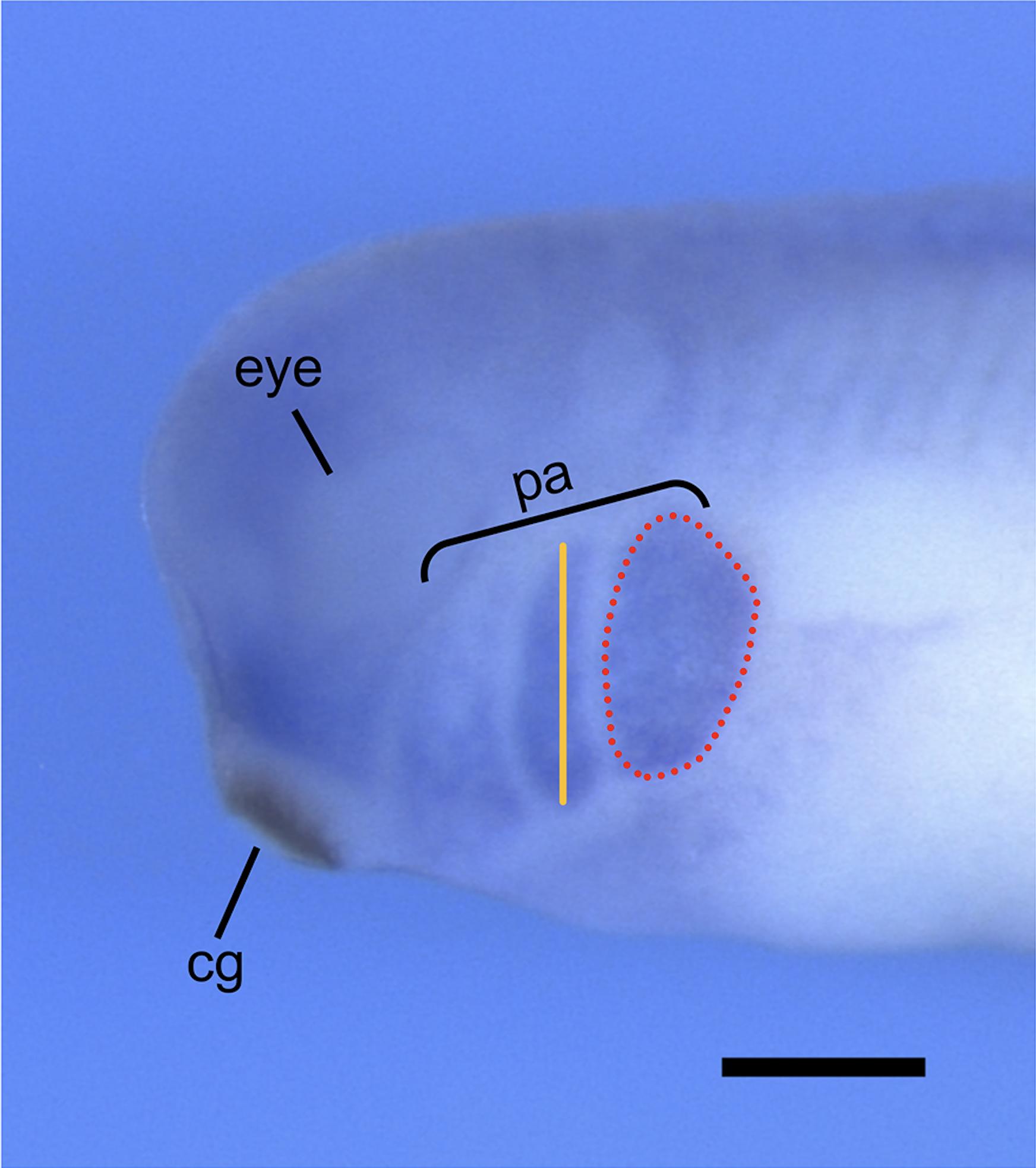 Figure S5: Representative image of stage 28 X. laevis embryo labeled for twist, a transcription factor that is critical for NCC specification and enriched in the pharyngeal arches. Measurements of the length (orange line) and area (red dotted line) of each individual pharyngeal arch can be done using ImageJ. cg, cement gland; pa, pharyngeal arch. Scale bar = 500μm.