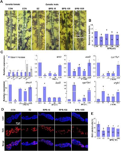 Fig. 2. Changes in gross gonadal morphology (A), the number of gonomeres in each testis (B), the relative expression of sex-dimorphic genes in gonad-mesonephros complexes (C), EdU-labeled proliferating cells in testes (D, E) of Xenopus laevis following exposure to bisphenol B (BPB) or estradiol (E2) from stages 45/46â52. The experiment was repeated three times using tadpoles from different sets of adults with similar results, and we show the results from one independent experiment. Data on cell proliferation are based on all observations from all sagittal sections (five or six) for each gonad. Data are shown as mean ±âSD (the aquarium as the statistical unit, nâ=â3). The values in column represent the number of animals. * indicates a significant difference between BPB treatment and controls (pâ<â0.05). Ligature represents a significant difference between the control males and females (two-tailed independent-sample t test, pâ<â0.05).