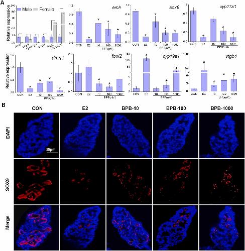 Fig. 4. Changes in relative expression of sex-dimorphic genes in gonad-mesonephros complexes (A) and Sox 9 protein (B) in testes of Xenopus laevis following exposure to bisphenol B (BPB) or 17Ã-estradiol (E2) from stages 45/46â66. Data are shown as mean ±âSD (the aquarium as the statistical unit, nâ=â3). *âindicates a significant difference compared with the control group (pâ<â0.05). Ligature represents a significant difference between the control males and females (two-tailed independent-sample t test, pâ<â0.05). Gonads were cut at cross section at 10âµm.
