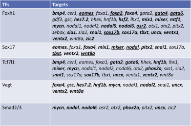Genes referenced: bmp4 cer1 ctnnb1 eomes foxa2 foxa4 foxh1 gata4 gata6 gli3 gsc hhex lhx1 mixer nodal nodal1 nodal2 osr1 osr2 otx1 otx2 sebox sia1 smad1 smad2 smad3 sox17a sox17b sox7 tbxt tcf7l1 vegt wnt8a