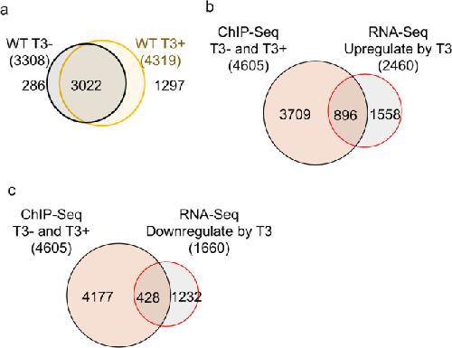 Fig. 4. Most of TR-bound genes are common between wild-type and TRα−/− intestine with or without T3 treatment.a Venn diagram of the TR target genes identified by ChIP-Seq in TRα−/− intestine with or without T3 treatment. Note that like in the wild-type intestine (Fig. 1a), most genes were bound by TR constitutively. b Venn diagram showing overlap between the TR-bound genes identified by ChIP-Seq in TRα−/− intestine and T3-upregulated genes in the intestine based on previous RNA-seq study19. Of the 3327 TR target genes identified by ChIP-Seq, 7% were shown as the T3-upregulated genes in TRα−/− intestine. Conversely, 27% of the T3-upreguated genes in TRα−/− intestine were found to be TR-bound. Both ratios were lower than those for the wild-type animals (Fig. 1b). c Venn diagram of comparison of genes detected by ChIP-Seq between wild-type (WT) and TRα−/− intestine. Of the 4605 TR target genes in wild-type intestine, nearly 70% or 3129 genes were bound by TR in TRα−/− intestine, presumably by TRβ, indicating that most of TR target genes in the intestine are commonly recognized by both TRα and TRβ. d Venn diagram comparison was made between 896 genes upregulated by T3 among all TR-bound detected in the wild-type intestine (Fig. 1b) and 1476 genes bound by TR only in the wild-type intestine (c). Of the 896 T3-upregulated genes that are bound by TR in wild-type intestine, 32% genes were genes bound by TR only in wild-type intestine, similar to the percentage of the genes bound by TR only in the wild-type intestine within all genes bound by TR in the wild-type intestine (1476 out of 4605). Similarly, of the genes bound by TR only in the wild-type intestine, 19% were upregulated by T3, just like the fraction of all TR-bound genes upregulated by T3 (Fig. 1b). e Venn diagram comparison was made between 896 genes upregulated by T3 among all TR-bound detected in the wild-type intestine (Fig. 1b) and 3129 genes bound by TR in both wild-type and TRα−/− intestine (c). Of the 896 T3-upregulated genes that are bound by TR in wild-type intestine, 68% genes were genes bound by TR in both wild-type and TRα−/− intestine, similar to the percentage of the genes bound by TR in both wild-type and TRα−/− intestine within all genes bound by TR in the wild-type intestine (3129 out of 4605). Similarly, of the genes bound by TR in both wild-type and TRα−/− intestine, 19% were upregulated by T3, again just like the fraction of all TR-bound genes upregulated by T3 (Fig. 1b). The results in D/E suggest that the genes bound by TR only in the wild-type intestine or both wild-type and TRα−/− intestine respond to T3 similarly in the wild-type animals.
