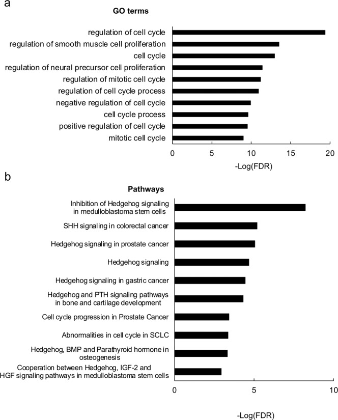 Fig. 2. GO terms and biological pathways related to cell cycle or hedgehog signaling that are enriched among TR-bound genes in intestine.a Top 10 enriched GO terms related to cell cycle. The GO terms that were enriched among genes bound by TR in the wild-type intestine were ranked based on FDR as shown in Supplementary Data 5. The most significant GO terms related to cell cycle were plotted here (see Supplementary Data 18 for raw data). b Top 10 enriched pathways related to cell cycle or hedgehog signaling. The biological pathways that were enriched among genes bound by TR in the wild-type intestine were ranked based on FDR as shown in Supplementary Data 6. The most significant pathways related to cell cycle or hedgehog signaling were plotted here (see Supplementary Data 19 for raw data).