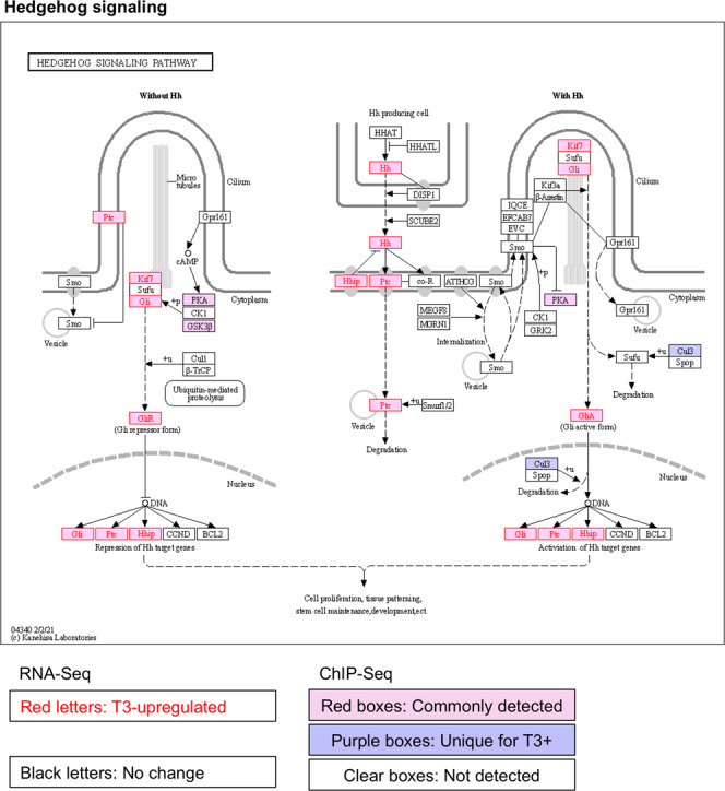 Fig. 3. TR-binding and regulation of genes in the hedgehog signaling pathway in intestine based on ChIP-Seq and RNA-Seq data.The hedgehog signaling pathway was visualized with regard to genes regulated by T3 based on RNA-Seq and/or bound by TR based on ChIP-Seq. The arrows show functional interaction: green for activation; red for inhibition. Letters in red indicate upregulated genes in wild-type intestine after T3 treatment. Letters in black indicate genes with no change in wild-type intestine after T3 treatment. Red boxes indicate ChIP-Seq detected genes both with and without T3 treatment, and purple boxes indicate genes identified by ChIP-Seq only in wild type with T3 treatment. Note that many genes including Sonic hedgehog (Hh) were upregulated by T3 and also bound by TR. No downregulated genes were found by RNA-Seq in this pathway.