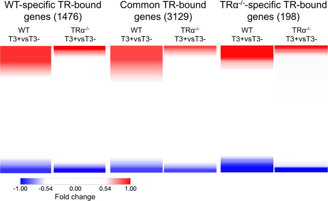 Fig. 5. T3 regulation profile of ChIP-Seq detected genes.Heatmap showing the fold change of gene expression in wild-type or TRα−/− intestine after 18 h T3 treatment as measured by RNA-Seq19, for TR-bound genes detected by ChIP-Seq in only the wild-type intestine (left), both wild-type and TRα−/− intestine (middle) or only TRα−/− intestine (right). Note that higher fractions of the TR-bound genes were upregulated (red) or downregulated (blue) by T3 were present in the wild-type-specific or common TR-bound genes than TRα−/−-specific TR-bound genes and that TRα knockout reduced T3-regulation, i.e., leading to lighter red or blue, for individual genes, suggesting that TRα−/− is important for gene regulation during the treatment. Note that the blank region between the red and blue areas are genes whose expression has no or little change after T3 treatment of wild-type or TRα knockout animals. The color range shows fold changes in log2 scale.