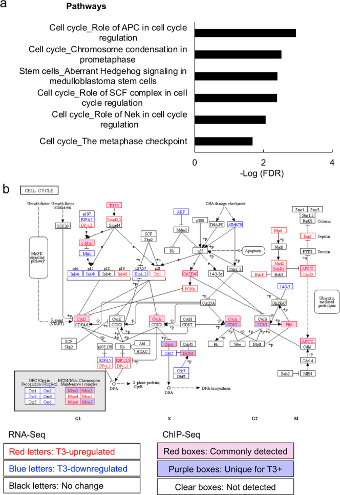 Fig. 6. TRα-dependent enrichment of cell cycle pathways among genes bound by TR in the wild-type intestine.a Top 10 cell cycle pathways differentially enriched among genes bound by TR in wild-type intestine. The pathways that were enriched among genes bound by TR in the wild-type intestine (Supplementary Data 6) were subtracted by the pathways that were enriched among genes bound by TR in TRα−/− intestine (Supplementary Data 12) to obtain the pathways only enriched in the wild-type intestine (Supplementary Data 14). The most significant 10 cell cycle-related pathways were plotted here (see Supplementary Data 20 for raw data). b TR-binding and regulation of genes in the pathway for cell cycle based on ChIP-Seq and RNA-Seq data. The pathway for cell cycle was visualized with regard to genes regulated by T3 based on RNA-Seq and/or bound by TR based on ChIP-Seq. The arrows show functional interaction: green for activation. Letters in red and blue indicate upregulated and downregulated genes, respectively, in wild-type intestine after T3 treatment. Letters in black indicate genes with no change in wild-type intestine after T3 treatment. Red boxes indicate ChIP-Seq detected genes both with and without T3 treatment, and purple boxes indicate genes identified by ChIP-Seq only in wild type with T3 treatment. Note that Cyclin A and CDK1 were among the genes directly bound by TR and upregulated by T3.