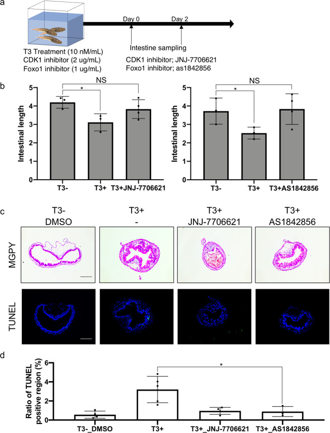 Fig. 7. Inhibiting CDK1 signaling blocks intestinal remodeling during T3-induced metamorphosis.a Experimental design for treatment with CDK1 and Foxo1 inhibitors. Wild-type tadpoles at stage 54 were treated with 2 μg/ml of CDK1 inhibitor JNJ-7706621 or 1 μg/ml of phosphorylation inhibitor of Foxo1 as1842856 for 2 days in the presence and absence of T3. Most of tadpoles treated with the inhibitors in the presence of T3 died at 3 days. Thus, intestinal remodeling was analyzed after 2 days of T3 treatment. b JNJ-7706621 and as1842856 inhibits T3-induced shortening of the intestine. Tadpoles at stage 54 were treated with or without 10 nM T3 for 2 days in the presence or absence of indicated inhibitor. Intestinal length was measured from bile duct junction to colon and normalized against body length. Each group included more than 4 tadpoles. Each bar represents the mean plus S.E. The asterisk (*) indicates a significant difference between the T3 treated tadpoles and control animals (P < 0.05) (see Supplementary Data 21 for raw data). c T3-induced intestinal morphological changes (epithelial folding) and apoptosis in the intestinal epithelium were inhibited by JNJ-7706621 and as1842856. Tadpoles were treated as above. Cross-sections of the intestine were stained with MGPY, which stains DNA blue and RNA red (top), and apoptotic cells were detected by TUNEL staining (bottom). TUNEL positive cells were stained green and nuclei were stained by Hoechst 33342 (blue). Bar indicates 20 μm (see Supplementary Data 21 for raw data). d Quantification of the apoptotic cells in c. TUNEL positive epithelium region was measured by using ImageJ software and normalized against the total epithelium region as determined by DAPI staining (see Supplementary Data 22 for raw data).