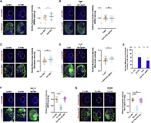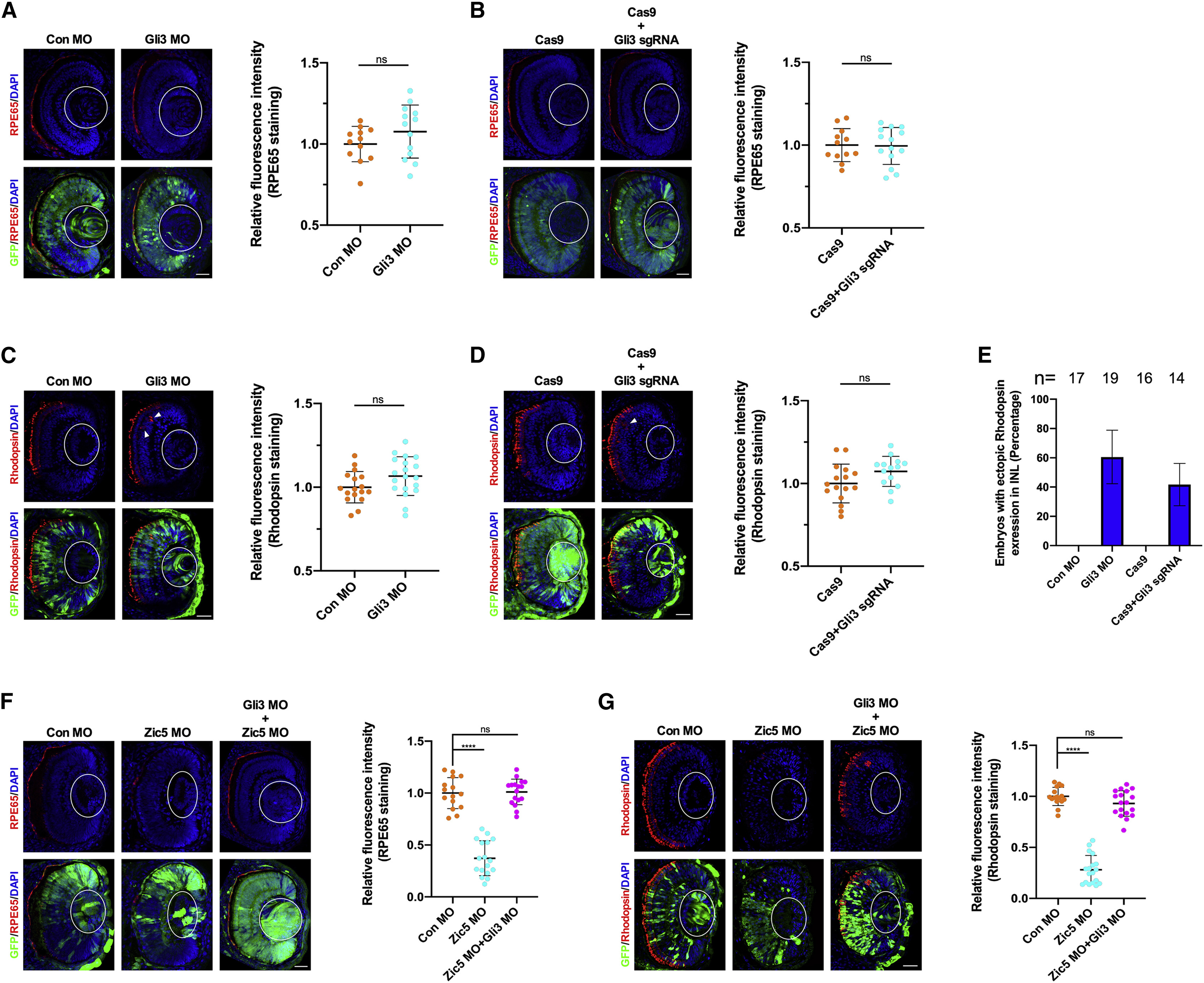 Figure 5. Zic5 regulates differentiation of RPE and rod photoreceptor layer through Gli3 (A) Gli3 knockdown impairs RPE layer differentiation. Quantification of relative RPE65 fluorescence intensity with unpaired t test; scale bar, 40 μm. Scatterplots represent means ± SD from three biological repeats, ns: no statistical differences between the groups. The lens is outlined with a white oval. (B) Gli3 knockout impairs RPE layer differentiation. Quantification of relative RPE65 fluorescence intensity with unpaired t test; scale bar, 40 μm. Scatterplots represent means ± SD from three biological repeats; ns: no statistical differences between the groups. (C) Gli3 knockdown impairs rod photoreceptor layer differentiation. Arrowhead indicates ectopic rhodopsin expression. Quantification of relative rhodopsin fluorescence intensity with unpaired t test; scale bar, 40 μm. Scatterplots represent means ± SD from three biological repeats; ns: no statistical differences between the groups. (D) Gli3 knockout impairs rod photoreceptor layer differentiation. Arrowhead indicates ectopic rhodopsin expression. Quantification of relative rhodopsin fluorescence intensity with unpaired t test; scale bar, 40 μm. Scatterplots represent means ± SD from three biological repeats; ns: no statistical differences between the groups. (E) Histograms represent the percentage of embryos from (C) and (D) with ectopic rhodopsin expression in the inner nuclear layer (INL) from three biological repeats. Error bars indicate standard deviation of error. (F) Gli3 knockdown rescues RPE layer differentiation impaired by Zic5 knockdown. Quantification of relative RPE65 fluorescence intensity with one-way ANOVA (Dunnett's multiple comparisons test), ââââp < 0.0001; scale bar, 40 μm. Scatterplots represent means ± SD from three biological repeats. (G) Gli3 knockdown rescues rod photoreceptor layer differentiation impaired by Zic5 knockdown. Quantification of relative rhodopsin fluorescence intensity with one-way ANOVA (Dunnett's multiple comparisons test), ââââp < 0.0001; scale bar, 40 μm. Scatterplots represent means ± SD from three biological repeats. |