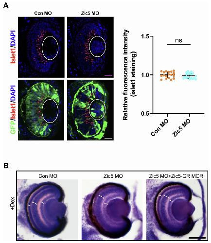 Figure S3. Related to Figure 2. Knockdown of Zic5 did not induce cell apoptosis or EdU incorporation in the eye. (A) Con MO or Zic5 MO was injected with GFP RNA into the D1.1.1 blastomere at 32 -cell stage. Embryos were sectioned and immunostained with cleaved-Caspase3 antibody at stage 37. P53 RNA injection was used as a positive control. Scale bar, 40 μm. (B) Con MO or Zic5 MO was injected with GFP RNA into the D1.1.1 blastomere at 32 -cell stage. Embryos were then injected intra-abdominally EdU (5-ethynyl-2ʹ-deoxyuridine; 1 mM) at stage37. Three hours after injection, embryos were harvested. Quantification of EdU positive cells in retina with unpaired t test, Scatterplots represent means ± s.d from three biological repeats, ns: no statistical differences between the groups. Scale bar, 40 μm. |