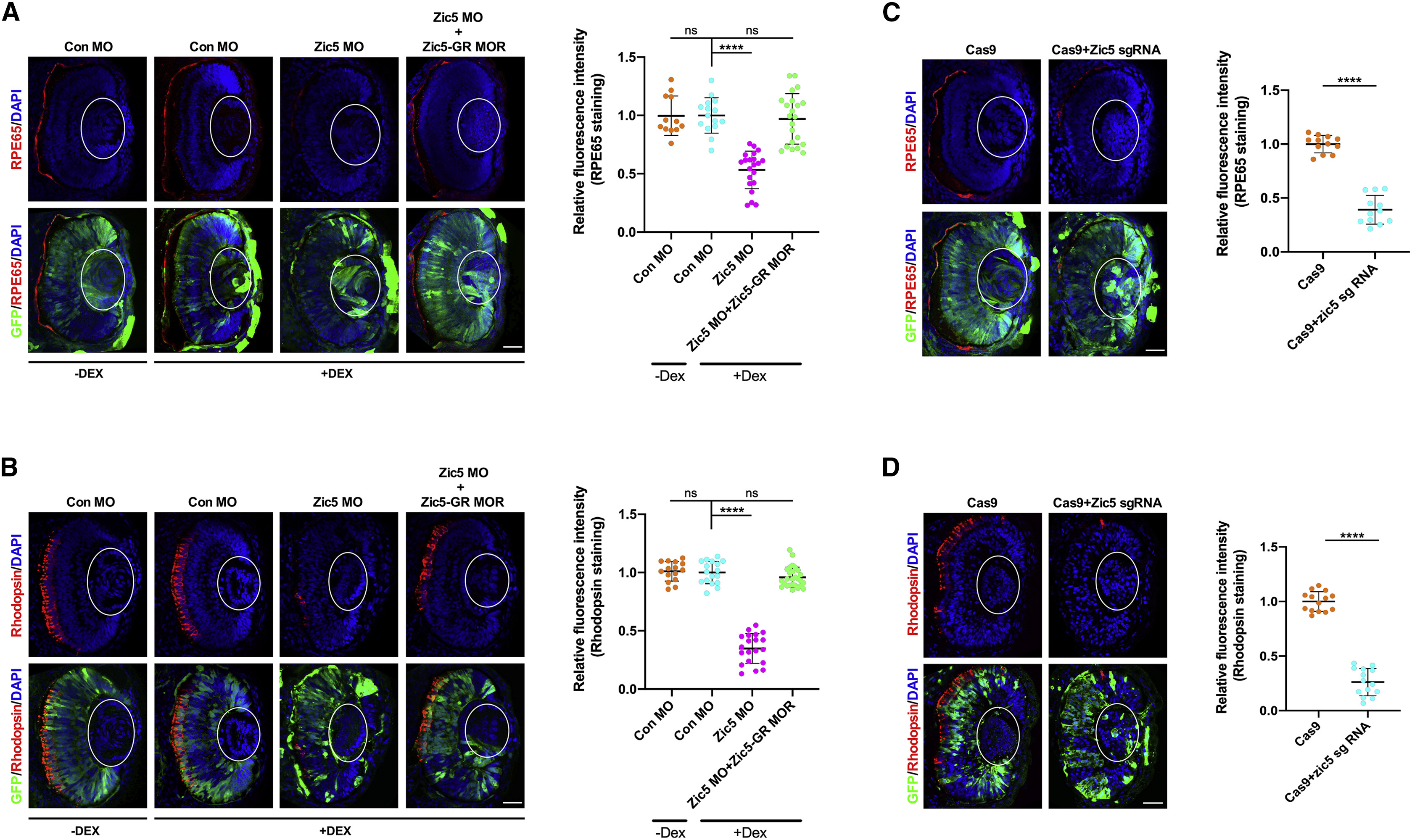Figure 2. Zic5 is a major regulator for the differentiation of RPE and the rod photoreceptor layer (A) Knockdown of Zic5 impairs RPE layer differentiation as marked by RPE65 immunostaining. The lens is outlined with white oval. Quantification of relative RPE65 fluorescence intensity with one-way ANOVA (Dunnett's multiple comparisons test), ââââp < 0.0001. Scatterplots represent means ± SD from three biological repeats. ns: no statistical differences between the groups. Scale bar, 40μm. (B) Knockdown of Zic5 impairs rod photoreceptor layer differentiation as marked by rhodopsin immunostaining. Quantification of relative rhodopsin fluorescence intensity with one-way ANOVA (Dunnett's multiple comparisons test), ââââp < 0.0001. Scatterplots represent means ± SD from three biological repeats. ns: no statistical differences between the groups. Scale bar, 40 μm. (C) Zic5 knockout impairs RPE layer differentiation as marked by RPE65 immunostaining. Quantification of relative RPE65 fluorescence intensity with unpaired t test, ââââp < 0.0001; scale bar, 40 μm. Scatterplots represent means ± SD from three biological repeats. (D) Zic5 knockout impairs rod photoreceptor layer differentiation as marked by rhodopsin immunostaining. Quantification of relative rhodopsin fluorescence intensity with unpaired t test, ââââp < 0.0001; scale bar, 40 μm. Scatterplots represent means ± SD from three biological repeats. |