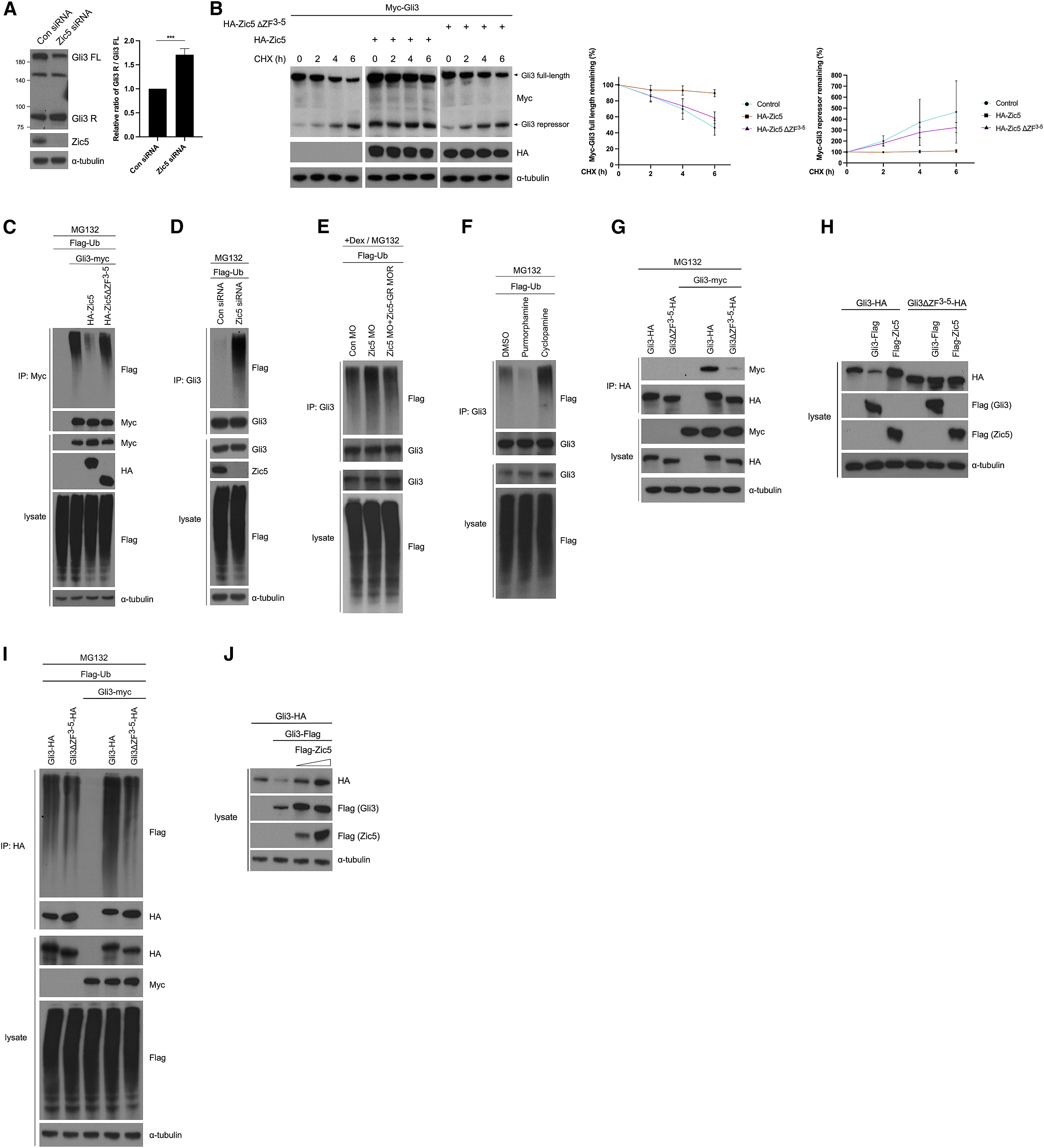 Figure 7. Zic5 stabilizes Gli3 through reducing its ubiquitination level (A) Western blot analysis using the indicated antibodies on lysates from HEK293T cells transfected with control siRNA or Zic5 siRNA. Quantification of relative ratio of Gli3R/Gli3FL of western blot with unpaired t test, âââp < 0.001. Histograms represent means ± SD from three biological repeats. (B) CHX assay indicating that Zic5 stabilizes Gli3 in HEK293T cells. The relative levels of Gli3 full-length and repressor were quantified and normalized against α-tubulin from three independent experiments. Error bars indicate standard deviation of error. (C) Zic5 overexpression decreases Gli3 ubiquitination in HEK293T cell. (D) Zic5 knockdown in HEK293T cells increases Gli3 ubiquitination. (E) Zic5 knockdown in Xenopus eyes increases Gli3 ubiquitination. (F) Cyclopamine treatment increases Gli3 ubiquitination, and purmorphamine treatment decreases Gli3 ubiquitination in Xenopus eyes. (G) Gli3-Gli3 interaction depends on 3rdâ5th ZF domains. (H) HEK293T cells were transfected with indicated plasmids and harvested 48 h after transfection. Cells were lysed and immunoblotted with indicated antibodies. (I) Gli3-Gli3 interaction increases its ubiquitination. (J) HEK293T cells were transfected with indicated plasmids and harvested 48 h after transfection. Cells were lysed and immunoblotted with indicated antibodies. |