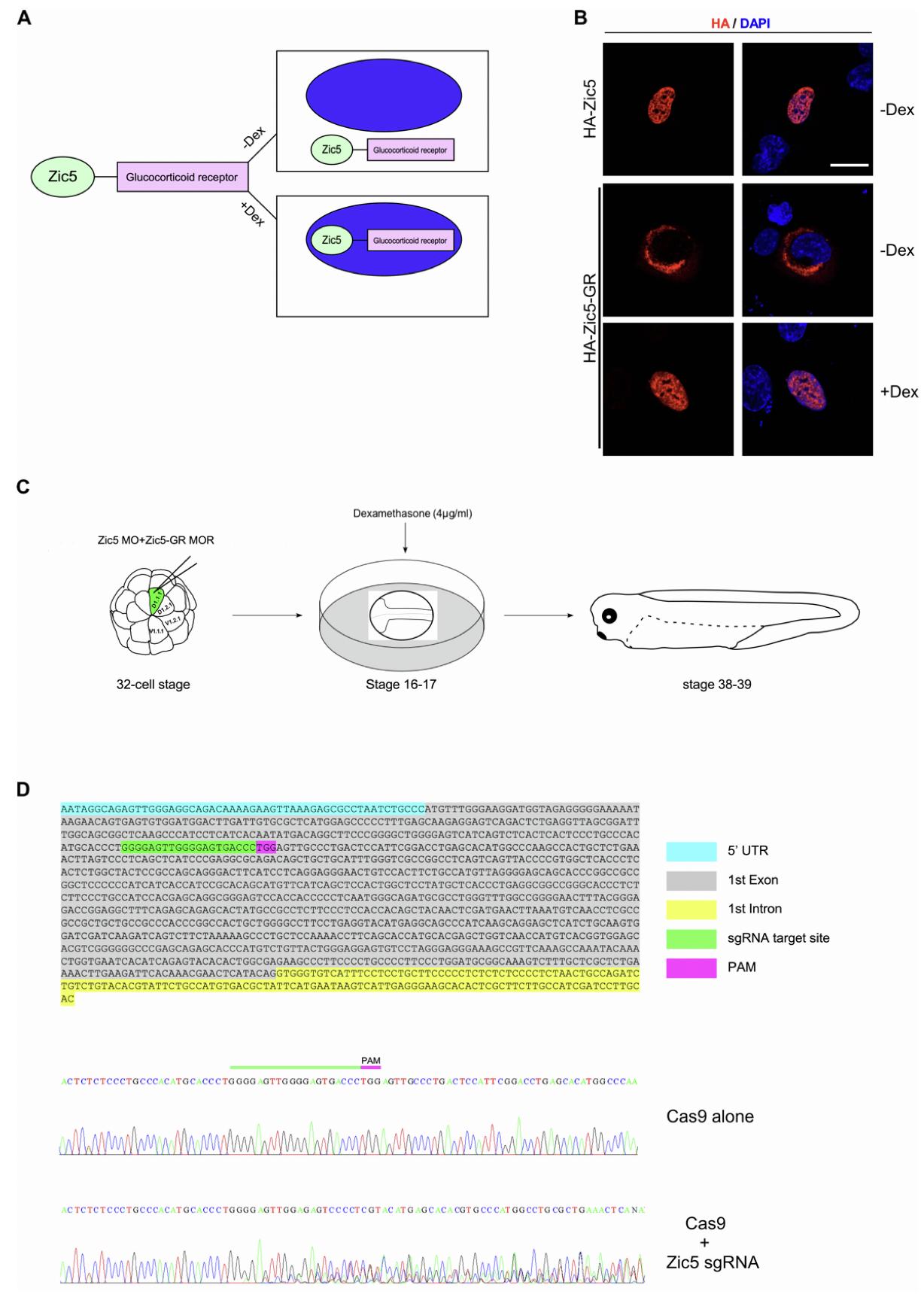 Figure S1. Related to Figure 1. Inducible Zic5-GR (glucocorticoid receptor) system and rescue experiment workflow. (A) Scheme for working model of Zic5-GR fusion construct in cell. (B) Validation of Zic5-GR construct in hRPE cells. HA-Zic5 localizes in the nuclear while HAZic5-GR shows cytoplasmic retention without dexamethasone treatment. This retention was released upon dexamethasone treatment for 30 min. Scale bar, 20 μm. (C) Scheme for Zic5-GR rescue experiments. (D) CRISPR/CAS9 targets the first exon of Zic5 gene. The direct sequencing of PCR amplicons shows the genomic DNA of Zic5 was edited by Cas9/Zic5 sgRNA co-injection. |