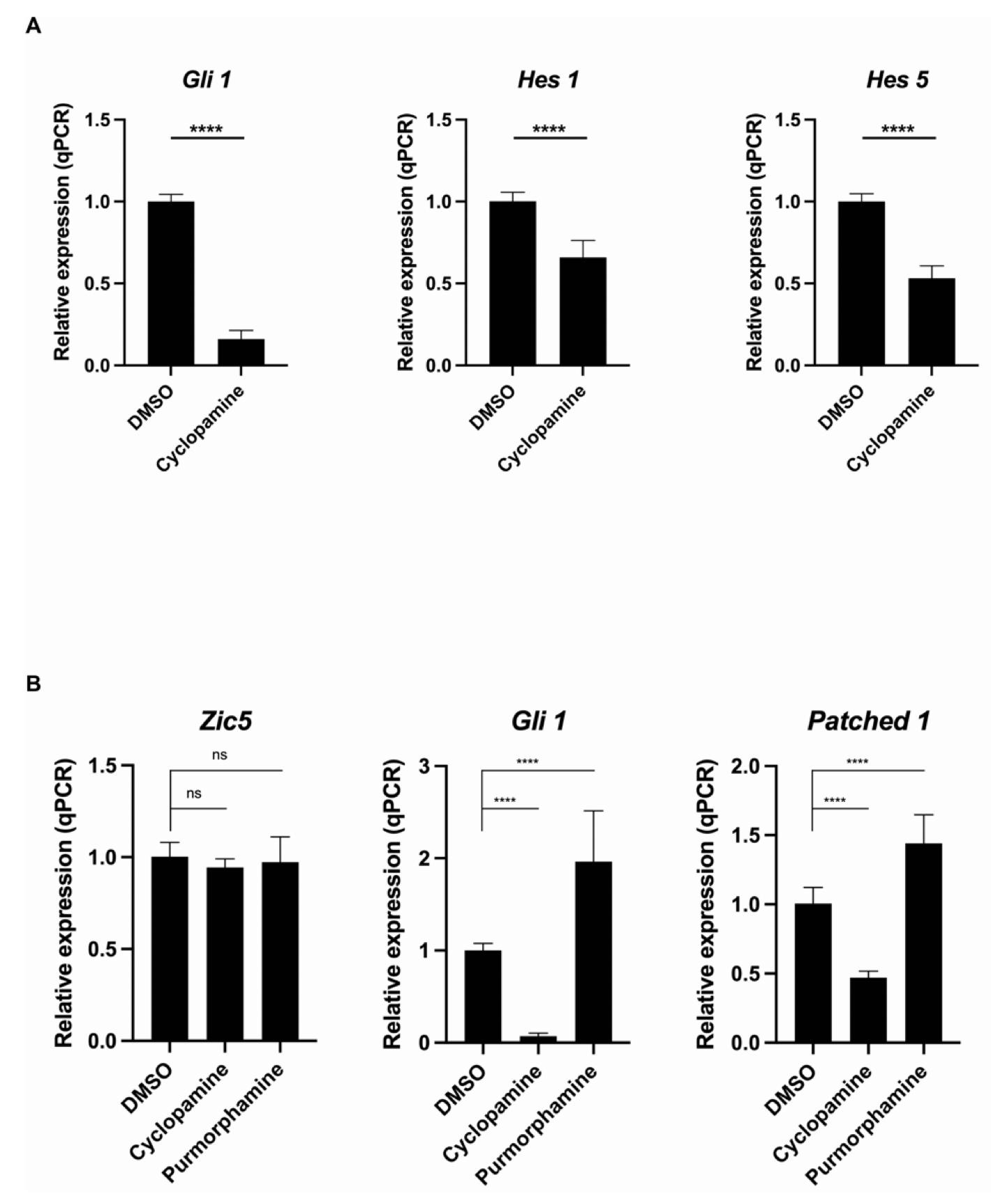 Figure S4. Related to Figure 3. The expression of Hes1 and Hes5 but not Zic5 was regulated by Hh signal in the developing eyes. (A) Embryos were treated with DMSO or cyclopamine from stage 18-19. 40 eyes per group were then dissected at stage 38 for quantitative PCR analysis. Quantification of normalized fold expression of indicated genes with unpaired t test, ****, P < 0.0001. Histograms represent means ± s.d. (B) Embryos were treated with DMSO or cyclopamine or purmorphamine from stage 18-19. 40 eyes per group were then dissected at stage 38 for quantitative PCR analysis. Quantification of normalized fold expression of indicated genes with one-way ANOVA (Dunnettâs multiple comparisons test), ****, P < 0.0001. Histograms represent means ± s.d. ns: no statistical differences between the groups. |