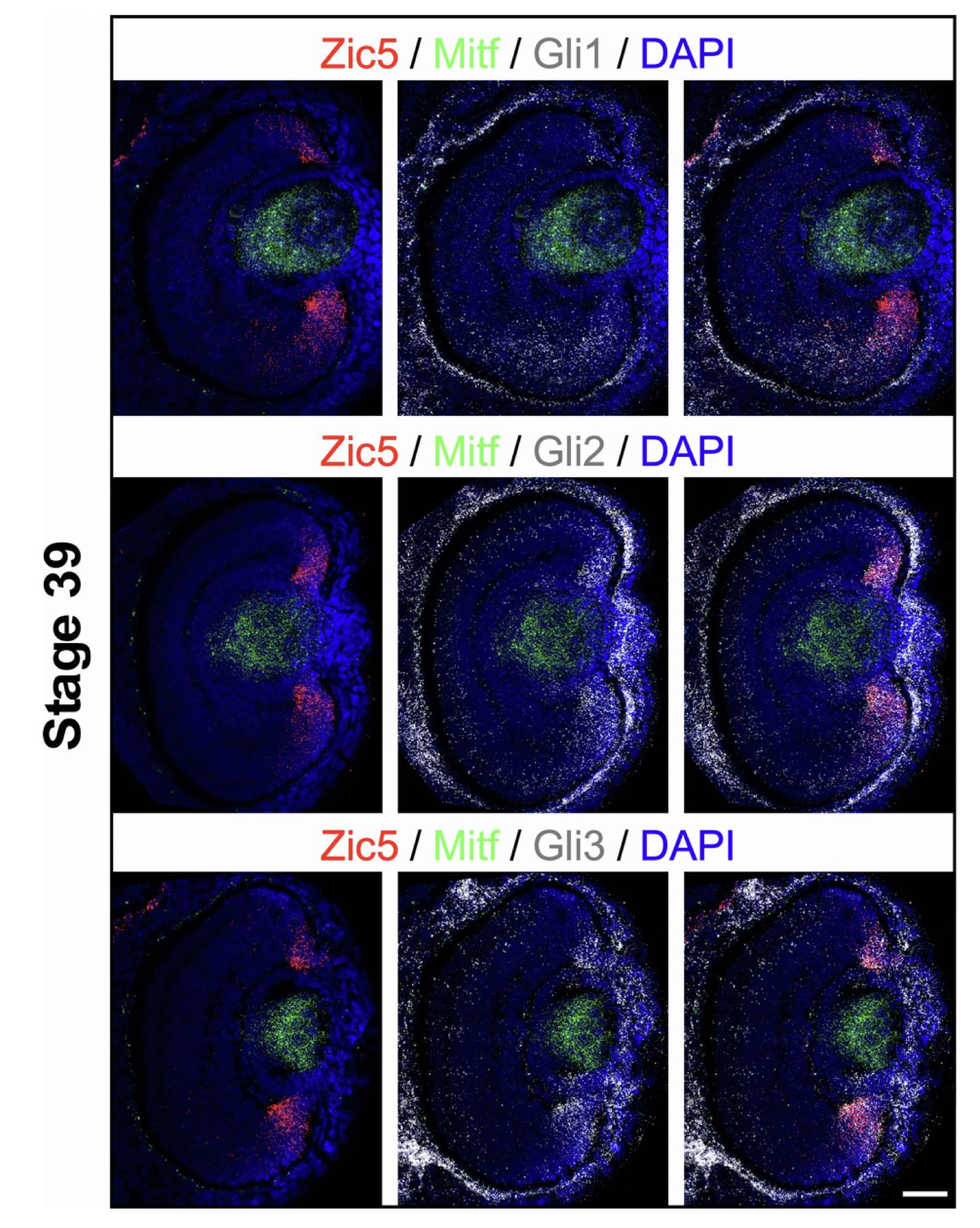 Figure S5. Related to Figure 4. Expression pattern of Zic5 and Glis in eyes at stage 39. Section HCR analysis was performed using embryos from stage 39 with indicated probe sets. Mitf probes were used as a RPE marker. Scale bars, 40 μm. |