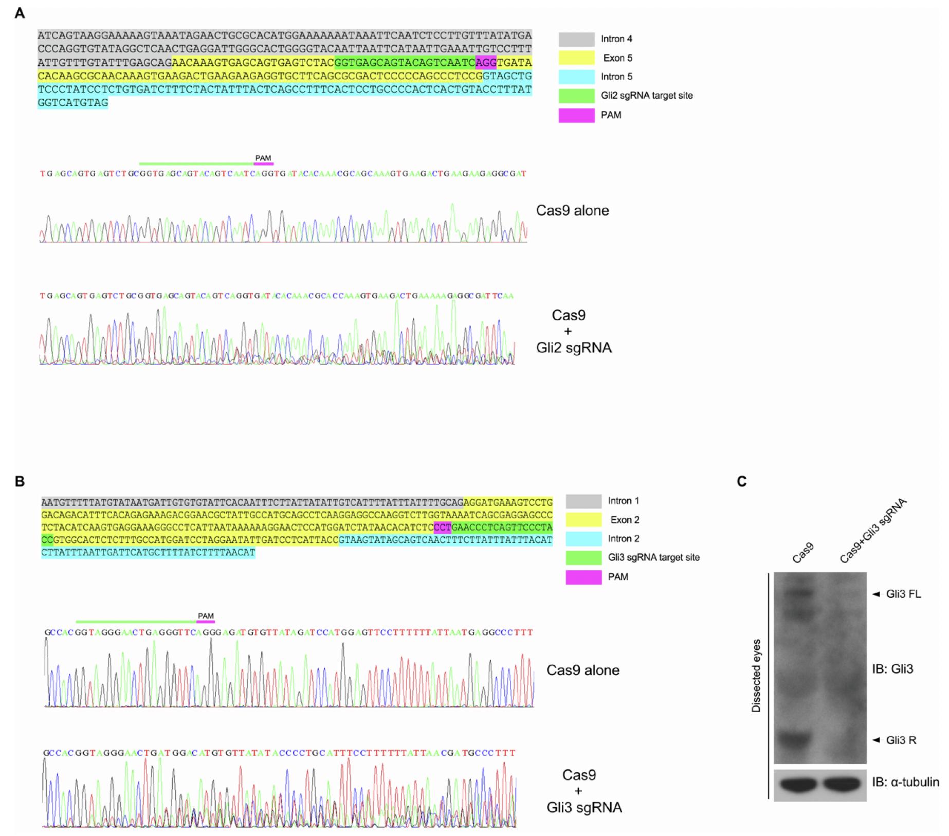 Figure S6. Related to Figure 4. Gli2 and Gli3 knockout by Crispr/Cas9 (A) Gli2 sgRNA targets the 5th exon of Gli2 gene. The direct sequencing of PCR amplicons shows the genomic DNA of Gli2 was edited by Cas9/Gli2 sgRNA co-injection. (B) Gli3 sgRNA targets the 2nd exon of Gli3 gene. The direct sequencing of PCR amplicons shows the genomic DNA of Gli3 was edited by Cas9/Gli3 sgRNA co-injection. (C) Verification of Gli3 knockout by western blot of endogenous Gli3 protein level. |