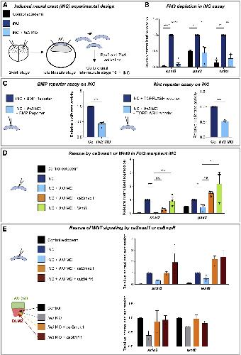 (E) Wnt8 and axin2 expression are rescued by ca-smad1 or caBMPR either in morphant iNC or in fhl3 morphant recombinants.