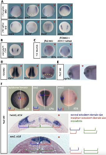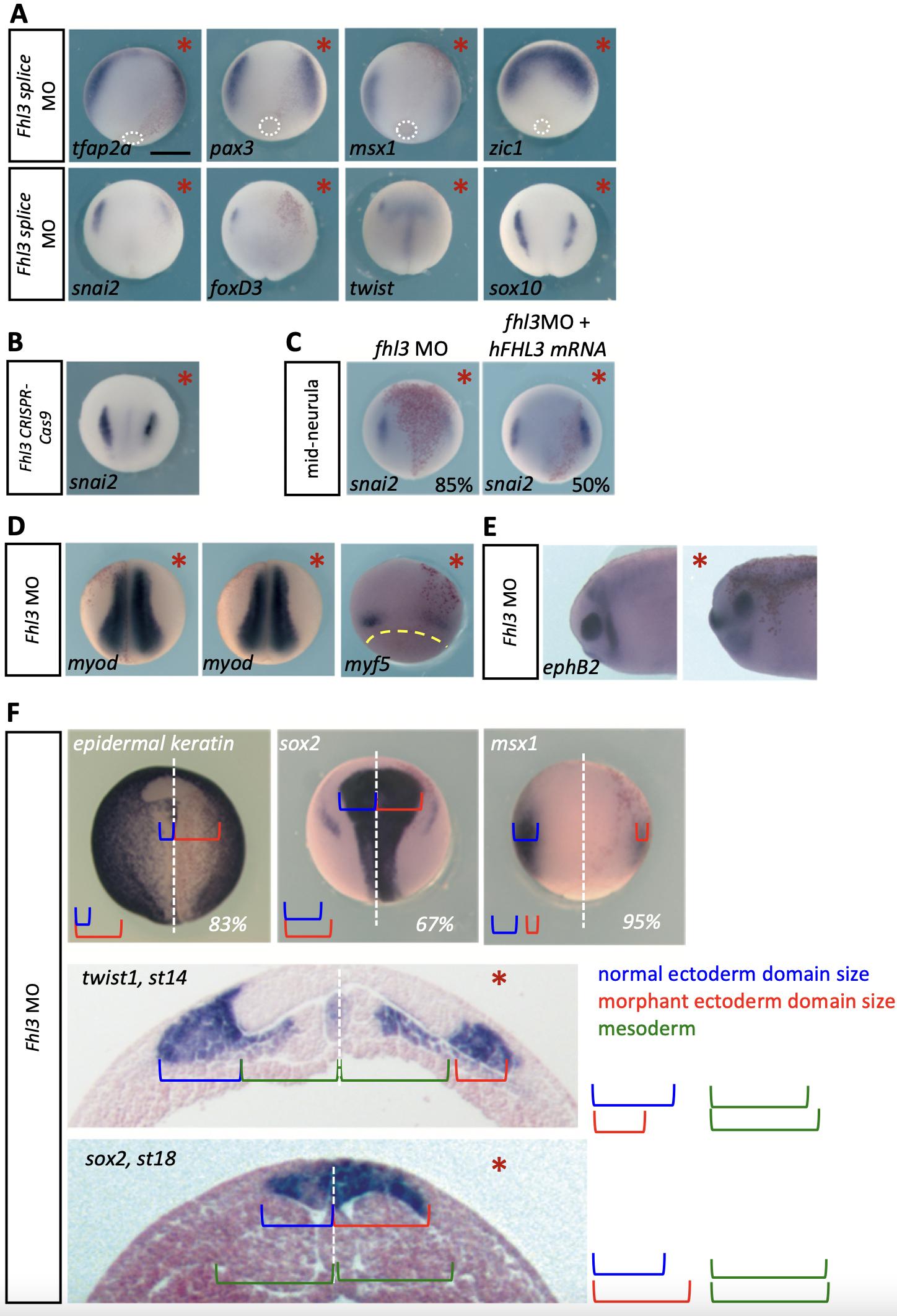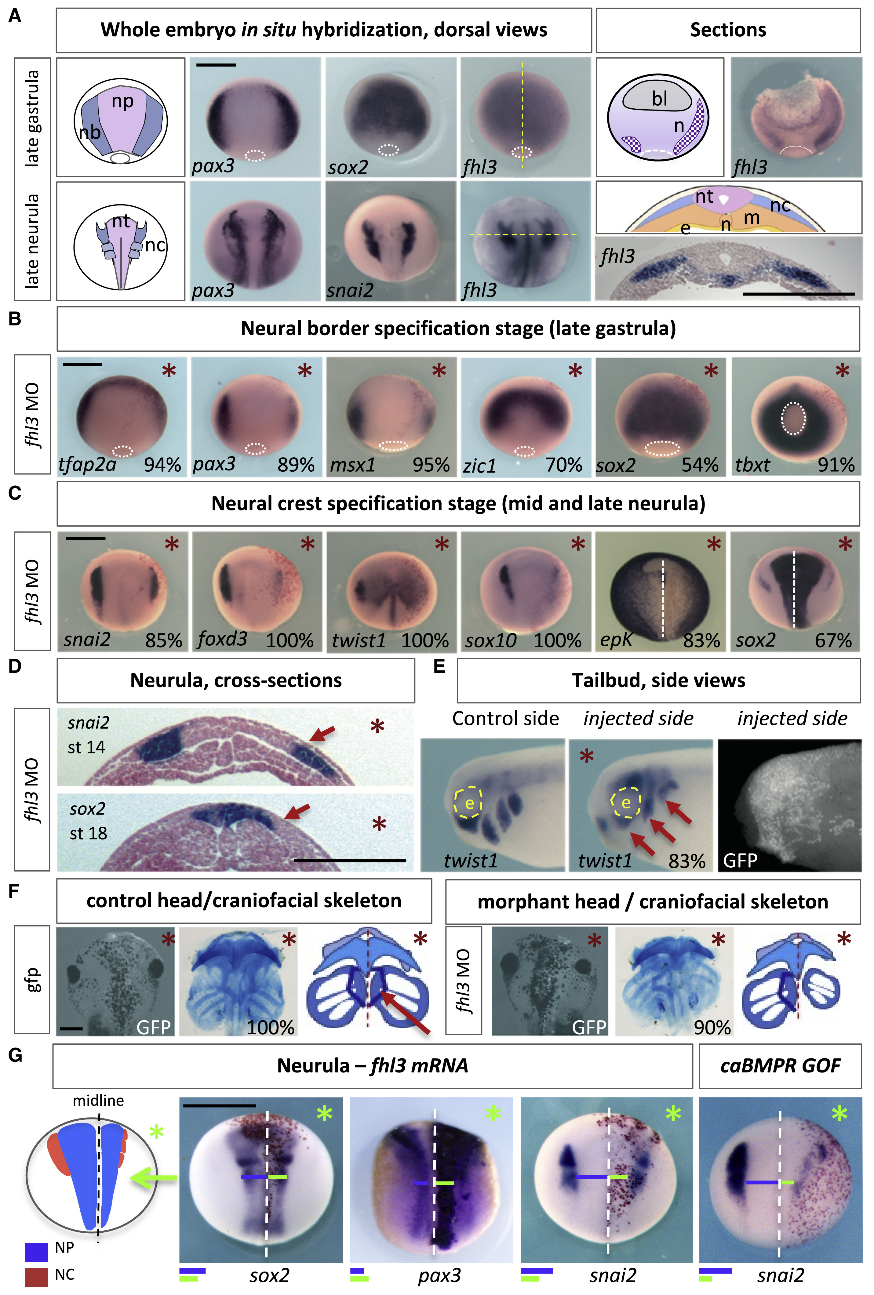 fhl3 morphant embryos. (F) After Fhl3 depletion, the size of NP (sox2 and epK-negative domain), NB (msx1), and NC (twist1) domains