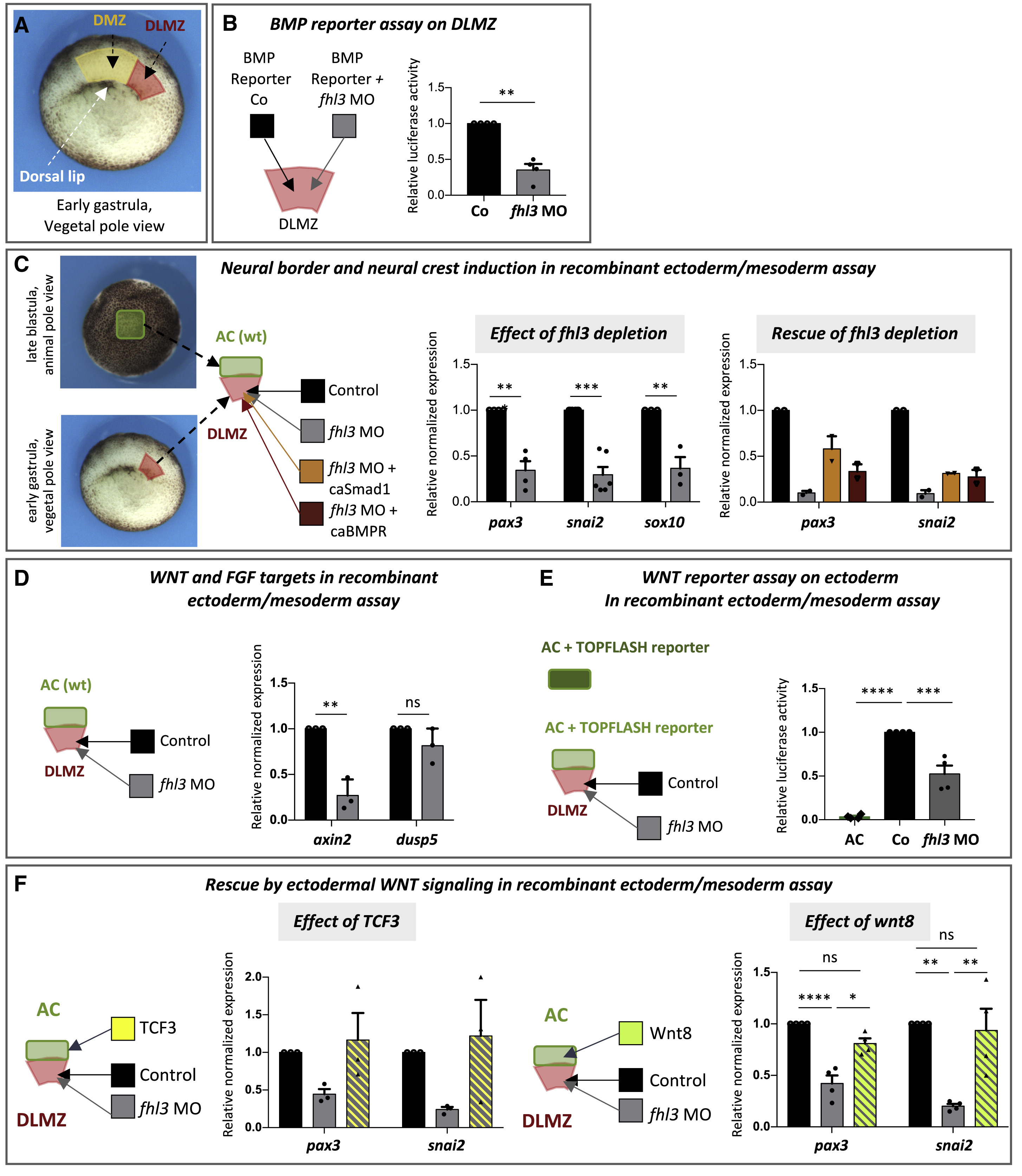 (E) WNT reporter-injected ectoderm shows decreased response when juxtaposed to a fhl3 morphant DLMZ, compared with a control DLMZ.
