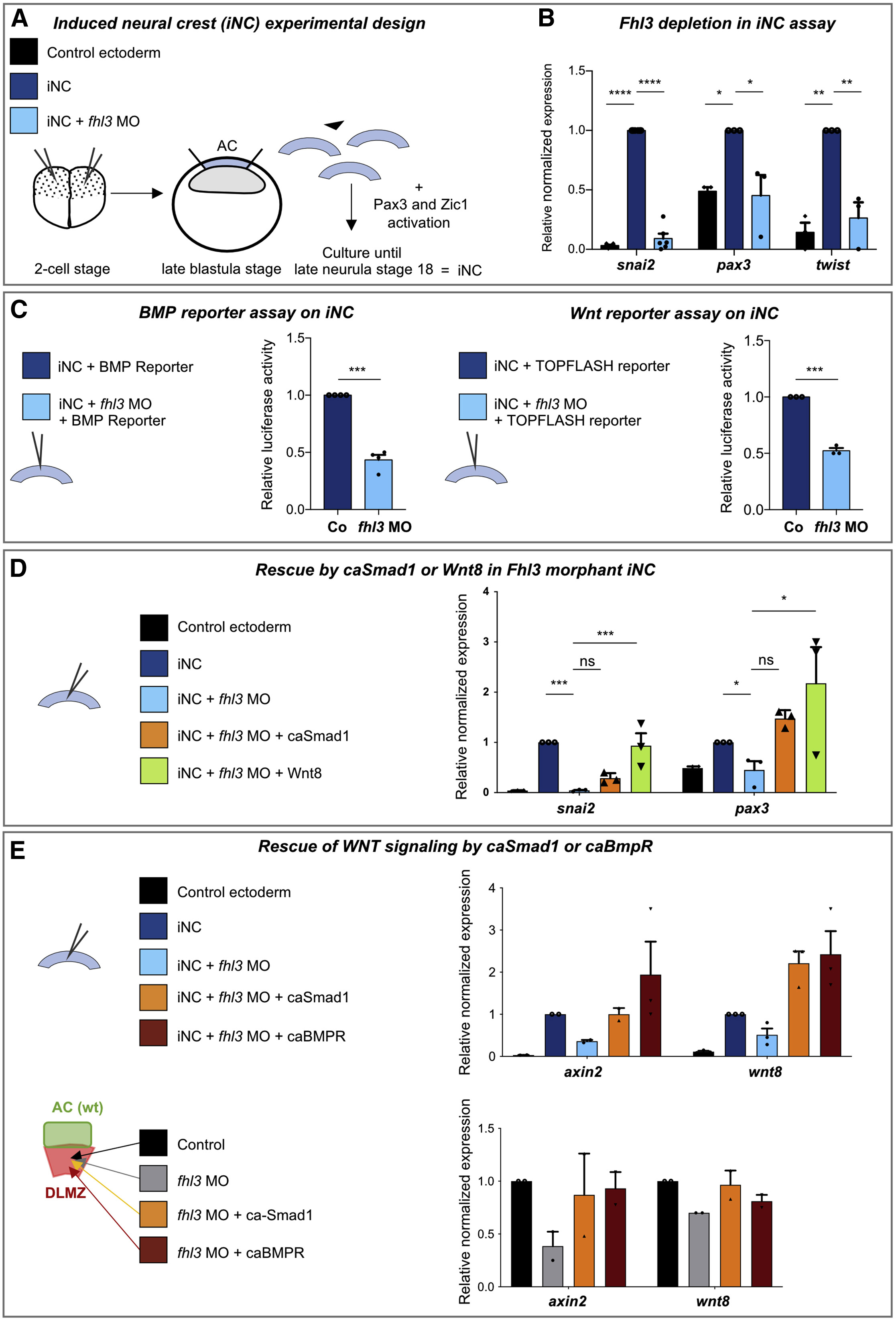 (D) Injection of ca-smad1 or wnt8 rescues NC induction in fhl3 morphant iNC.