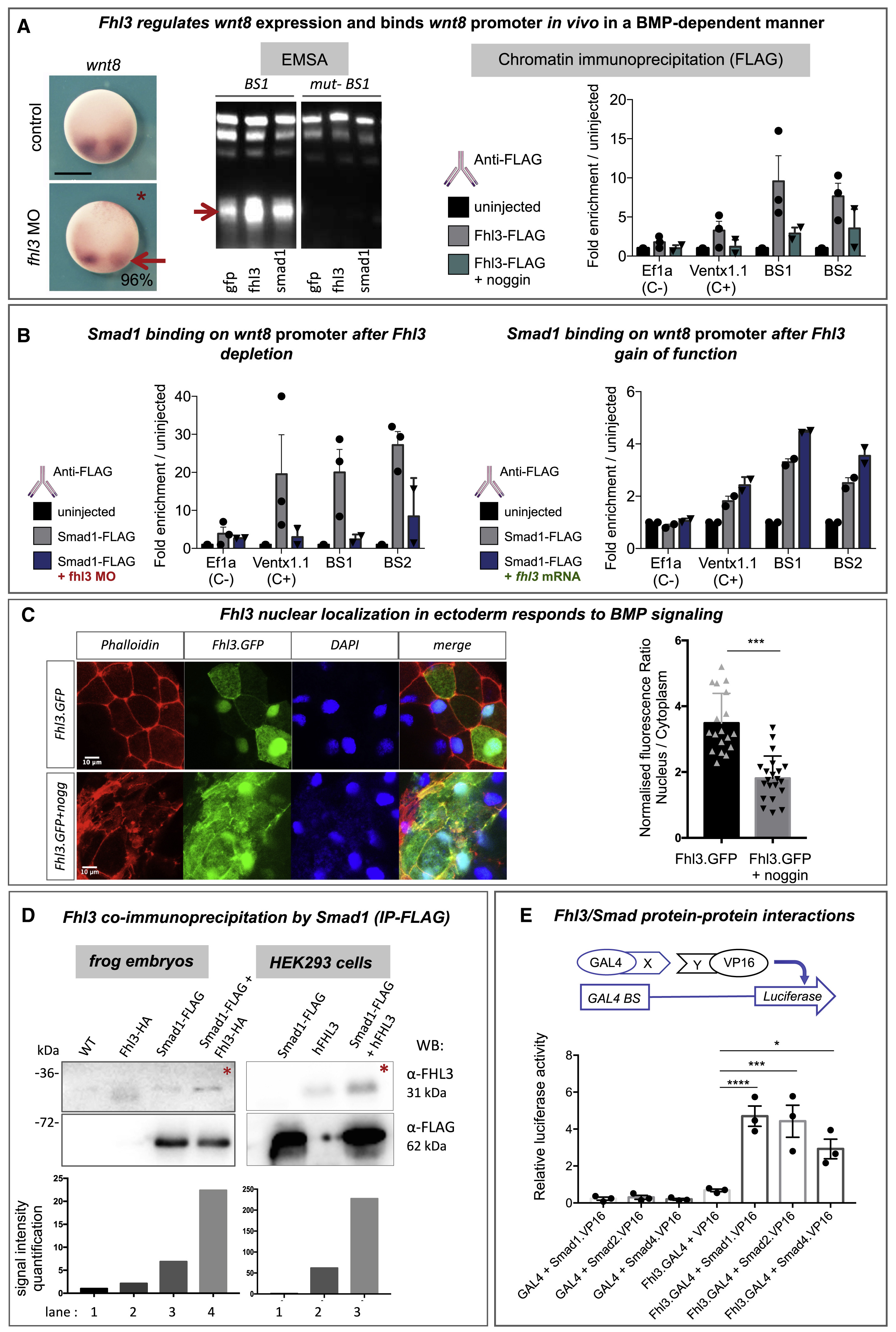 (A) Wnt8 expression decreases in fhl3 morphant mesoderm in vivo after unilateral injection (asterisk; decrease in 96% of cases, arrow), while wnt8 is symmetrical in 93% of control siblings. Fhl3 and Smad1 bind to BS1, but not mutated BS1 (EMSA, shifted WT-BS1 primer indicated by arrow). At late gastrula stage in vivo, Fhl3 binds to BS1, BS2, and ventx1.1 BRE, but not to EF1a sequences. In the presence of Noggin, Fhl3 binding on those sequences is strongly reduced. Scale bar: 500 μm.