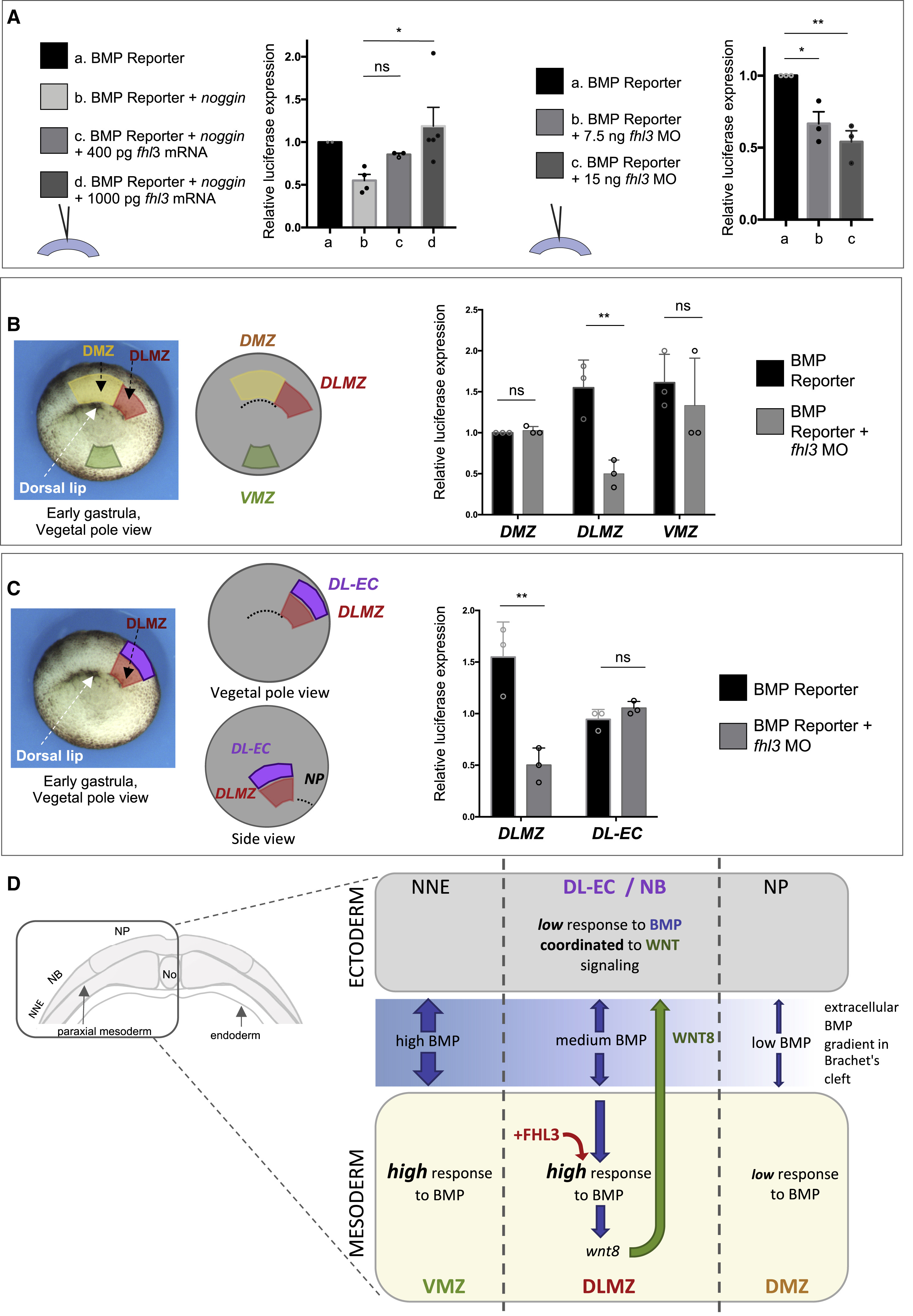(B) Fhl3 role in the BMP-responsive mesoderm was directly assessed by dissection and separate analysis of each type of tissue. High BMP response is seen in VMZ and DLMZ, while DMZ shows lower response (set to basal level). In contrast with the dorsal and ventral mesoderm, Fhl3 depletion specifically affects BMP activity in the dorsal-lateral mesoderm, changing the high response to background level response.