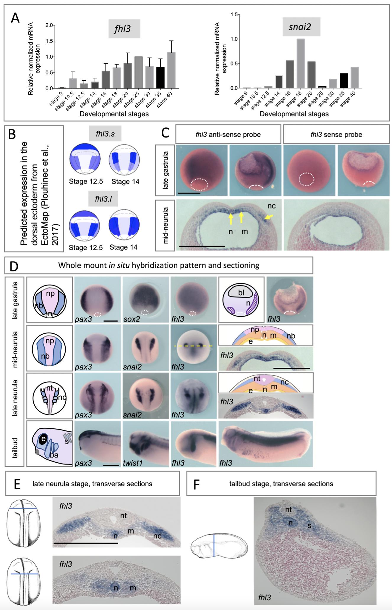 (E-F) Transverse sections at late neurula stage show fhl3 expression in the premigratory NC, the notochord and the somites. Transverse sections at tailbud stage show fhl3 expression in the notochord and the somites.
