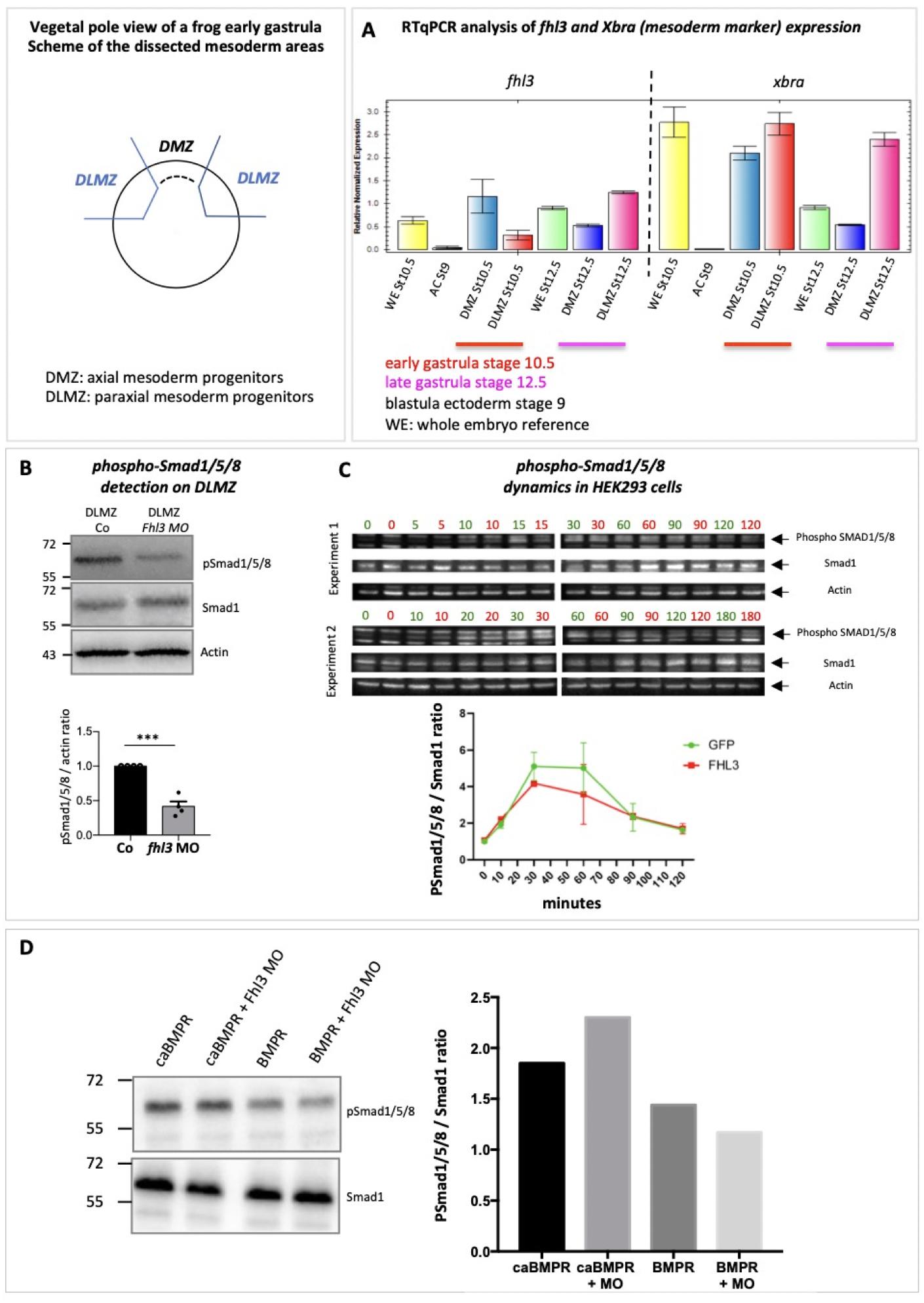 Supplementary Figure S3. Fhl3 expression in paraxial mesoderm; impact on Smad1/5/8 phosphorylation. (A) Quantification of the relative levels of FHL3 in the axial and paraxial/intermediate mesoderm (DLMZ) by qRT-PCR shows increased expression in the DLMZ mesoderm at late gastrula stages when neural border is induced, compared to early gastrula stage.