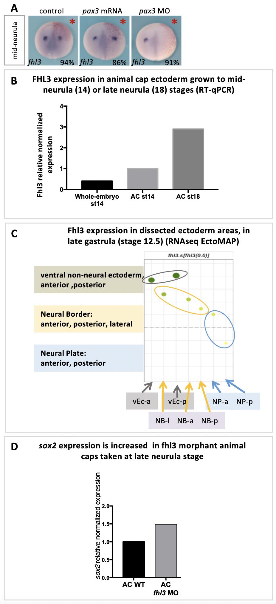(C) EctoMap transcriptome data (Plouhinec et al., 2017) show graded fhl3 expression in various areas of the developing ectoderm: high levels are found in the non-neural ectoderm (vEc-a and v-Ec-p) while neural border (NB-l, NB-a and NB-p) displays moderate expression and neural plate (NP-a, NP-p) ectoderm display low levels.