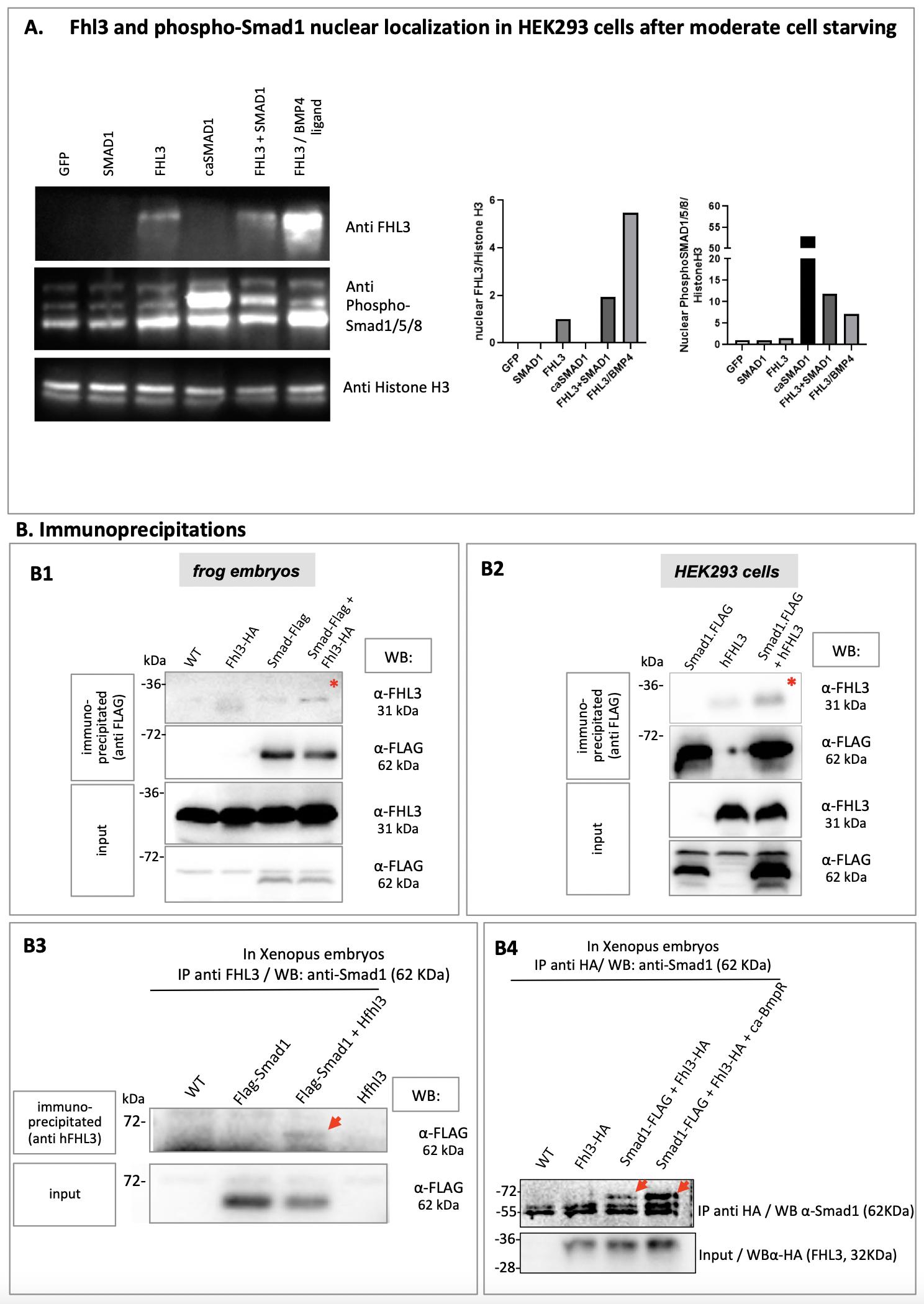 Blot B1: in X. laevis embryos: after IP with an anti FLAG antibody to pull down FLAG-Smad1, hFHL3 is detected (same blot as in Figure 4D, with additional input lanes). Note that the first input lane shows endogenous xenopus Fhl3 protein as well as the HA-tagged hFhl3 injected in low amounts.
