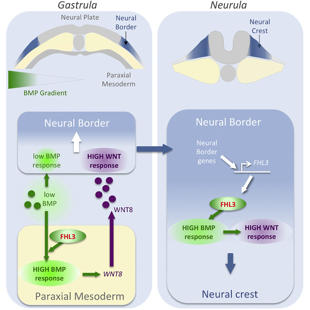 Figure 2. Fhl3 is necessary for BMP signaling and WNT-dependent NC induction by the mesoderm