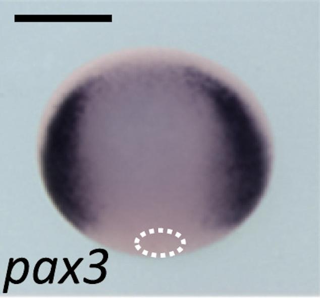 pax3 (paired box 3) gene expression in Xenopus laevis embryo, via in situ hybridization, NF stage 12, vegetal, dorsal view.