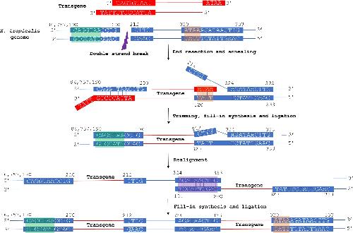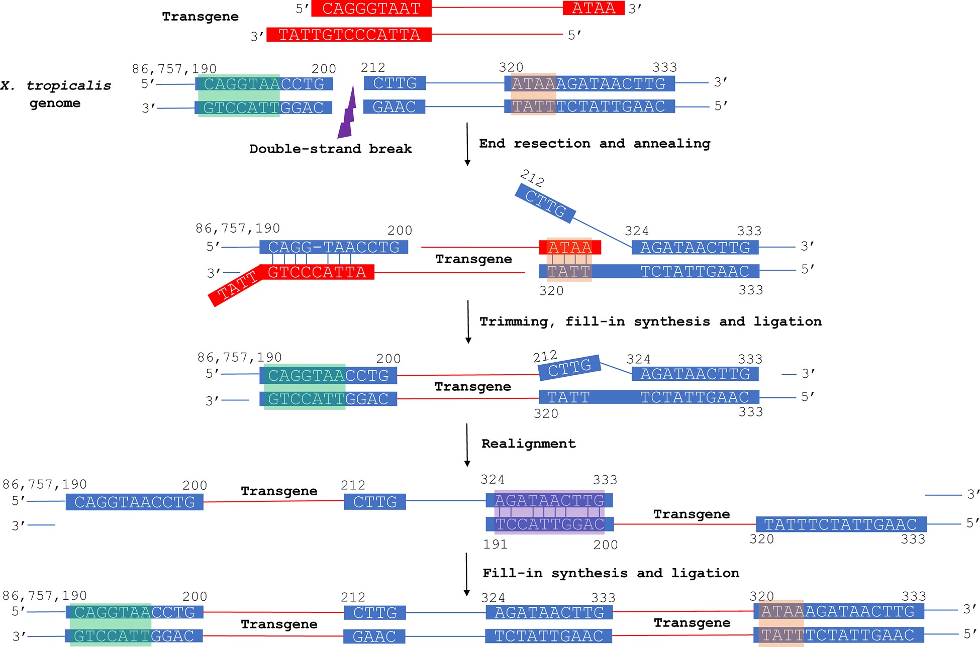 Fig.5. A model for I-SceI-mediated transgenesis that resulted in the snai2:eGFP X. tropicalis line. Genomic DNA is shown in blue and transgene construct in red. Green and orange boxes highlight the sequence homology between the genomic DNA at the junctions and the I-SceI recognition sequence at the left end of transgene construct and the 3â²-overhang generated by I-SceI cleavage at the right end, respectively. Purple box highlights the homology between the upstream and downstream genomic sequences at the initial transgene insertion site that possibly led to a subsequent realignment. See Discussion for further explanation.