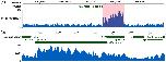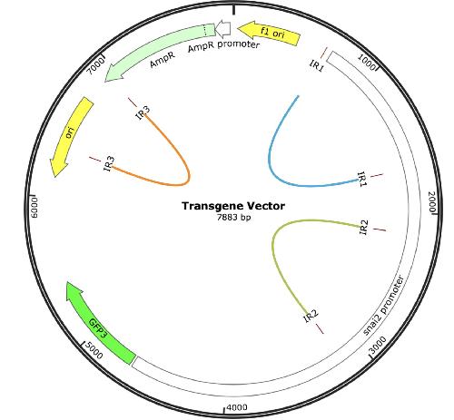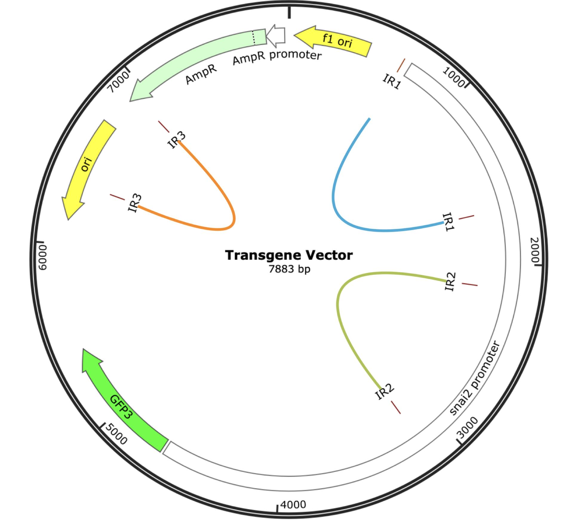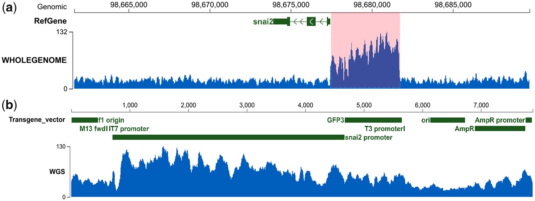 Fig.2. Sequencing depth of WGS reads mapped to the snai2 gene and transgene sequences. a) Sequencing depth of the snai2 gene and surrounding region on chromosome 1. The snai2 promoter, which is also part of the transgene construct, is highlighted in pink, and the transcribed region is shown in green. b) Sequencing depth of different regions of the transgene. Reads with low mapping quality, including those with low complexity and those perfectly mapped to other regions of the genome, have been removed. Y-axis represents sequencing coverage.