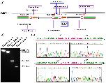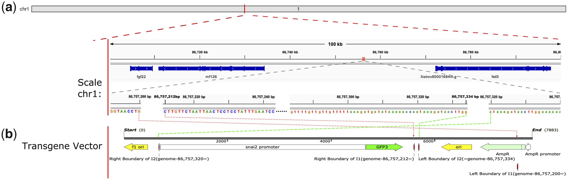 Fig.3. Mapping of the 2 transgene integration loci to chromosome 1 of the X. tropicalis genome. a) Localization of the transgene insertions in chromosome 1. The 100-kb surrounding region (middle) includes the nearby genes, and the insertion region is further zoomed in to show the locations of the 2 transgene integration sites and the genomic DNA sequences at the boundaries (bottom). b) A linear map of the transgene construct. The genomic DNA and transgene sequences are connected with red and green dotted arrows, respectively, at the 2 integration sites (I1 and I2). See Supplementary Fig. 1 for WGS reads that align with the junctions of transgene integration sites. Junction sequences were further confirmed by PCR and Sanger sequencing (see Fig. 4).