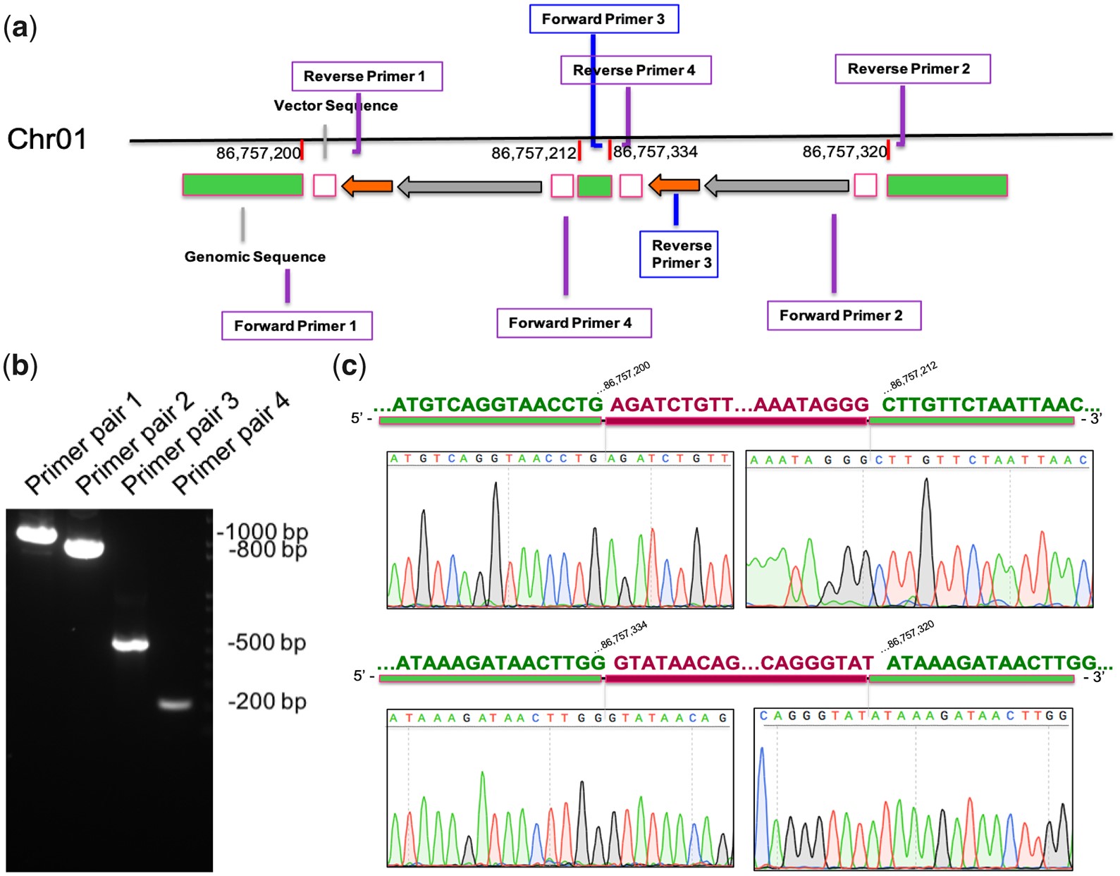 Fig.4. Locations of primers and PCR validation of transgene integration sites. a) Design of PCR primers. Primer pairs 1 and 3 covered the left boundaries of the transgene integration sites (I1 and I2), primer pair 2 covered the right boundary of I2, and primer pair 4 covered the region between I1 and I2 along with the flanking transgene sequences. Green bars represent Xenopus genomic DNA, gray and orange arrows represent the snai2 promoter and eGFP coding sequence from the transgene, respectively, and white blocks represent the vector sequences from the transgene. Segments are separated from each other for better visualization. b) PCR amplifications of junction sequences using the primers shown in (a). c) Sanger sequencing results across the insertion boundaries of I1 (upper) and I2 (lower).