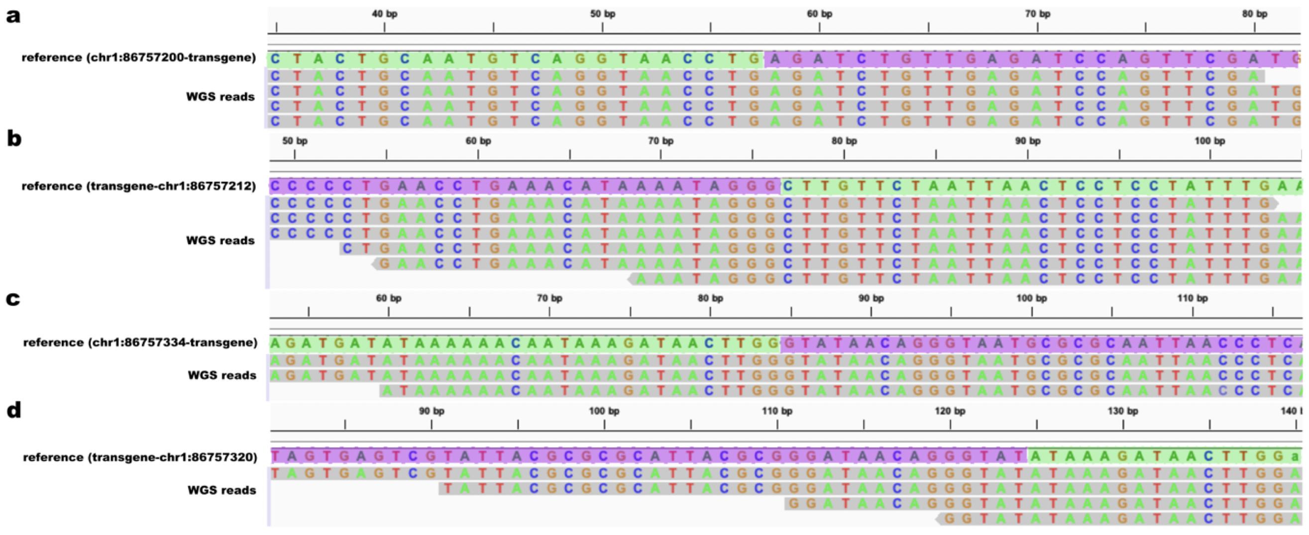 Figure S1. WGS reads mapped to the reconstructed Chromosome 1 with the inserted transgene. Soft-clipped reads were aligned to the left (a) and right (b) boundaries of transgene integration site 1 (I1), as well as the left (c) and right (d) boundaries of integration site 2 (I2). X. tropicalis genome, transgene sequence and WGS reads are highlighted with green, purple and gray, respectively.