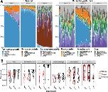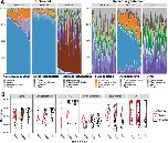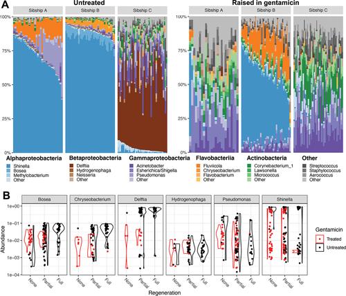 Figure 2. Genus-level interactions between sibship, antibiotic treatment and regeneration. (A) The relative abundance of genera within the five most abundant bacterial classes in treated and untreated sibships, highlighting the three most abundant genera in each. Read counts were rarefied to 1500 reads. (B) Violin plots show log-transformed relative abundance (y-axis) of six genera positively associated with regeneration