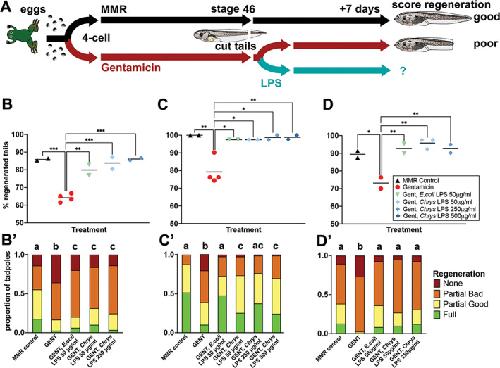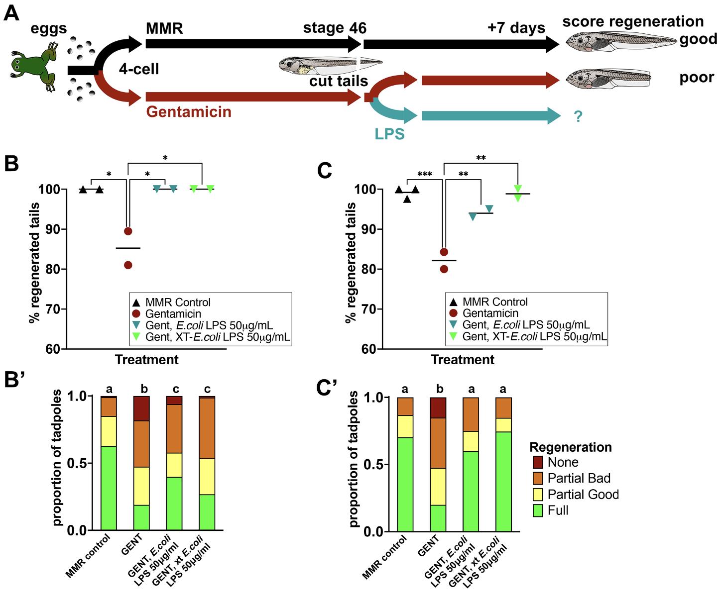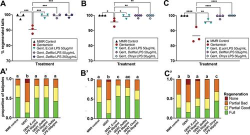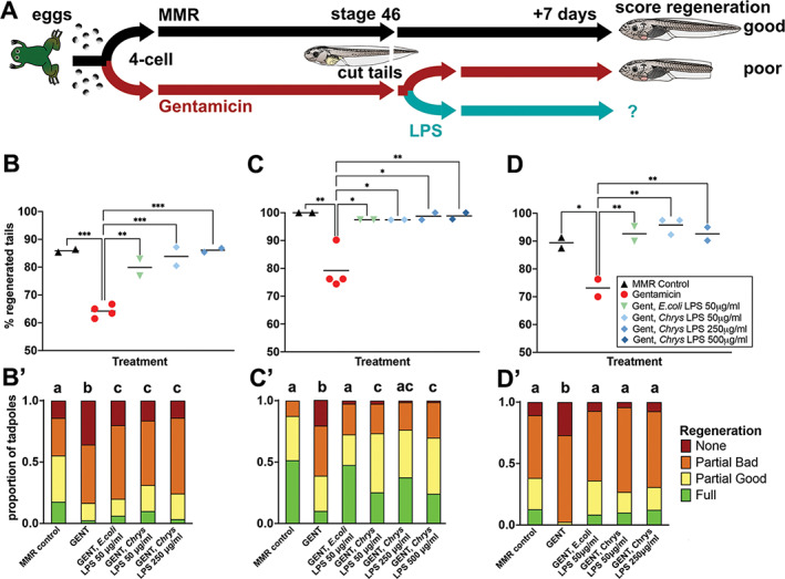 FIGURE 4. LPS from the commensal bacterium Chryseobacterium spp. XDS4 rescues regeneration in stage 46 tadpoles raised in the antibiotic gentamicin (gent). (A) Timeline of treatments. (B–D) Data from three sibships of tadpoles. Each point represents the percentage of tadpoles regenerating any tissue at all, is the sum of full, partial good and partial bad tadpoles and is a replicate Petri dish with sample size of 38‐48 (A), 35‐43 (B) or 23‐43 tadpoles per dish. (C) One‐way ANOVA with Tukey post hoc comparisons of all means. *p < .05, **p < .01, ***p < .001, ****p < .0001. (A′–C′) are stacked categorical graphs of the same tadpoles, showing the proportion of each phenotype by dish. Compact letter display has been used to indicate statistical significance; each treatment is assigned a letter, with treatments within the same letter group having no statistically significant difference from each other. Extended Cochran–Armitage test, followed by post hoc pairwise ordinal independence test with Benjamini–Hochberg correction. Raw data can be found in the Supporting information S1