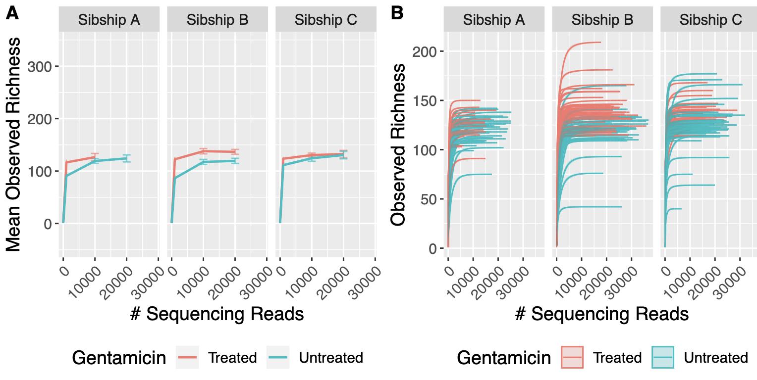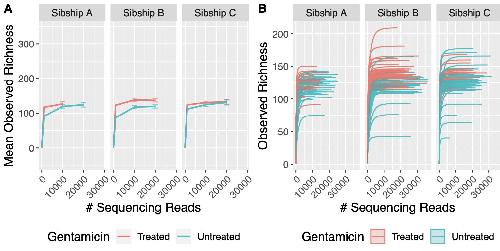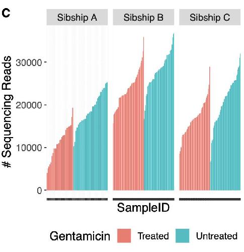 24 tadpoles per dish, with the exception of controls for Sibship B where N = 22 as two died in each before they could be scored for regeneration. Unpaired t-tests, *p < .05, **p < .01. (B0) Stacked categorical graphs comparing regeneration phenotypes for each sibship. Linear-by-Linear association test, ****p < .0001. (C) Principal coordinates analysis (PCoA) ordination plot of tadpole tail samples with >1500 reads, calculated based on BrayâCurtis distance. (D) Pie charts showing the percentage of Gram-negative versus Gram-positive annotated reads for each sibship when raised with or without gentamicin. (E) Relative abundance of the 10 most abundant bacterial classes in tadpole tail skin, stratified by sibship and treatment status. Raw data can be found in Supporting information S1 [Color figure can be viewed at wileyonlinelibrary.com]