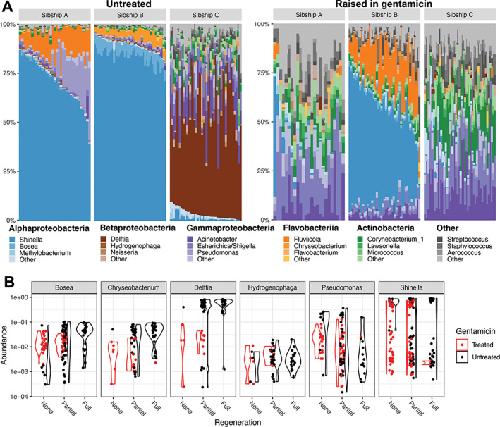 FIGURE 2. Genus‐level interactions between sibship, antibiotic treatment and regeneration. (A) The relative abundance of genera within the five most abundant bacterial classes in treated and untreated sibships, highlighting the three most abundant genera in each. Read counts were rarefied to 1500 reads. (B) Violin plots show log‐transformed relative abundance (y‐axis) of six genera positively associated with regeneration (q < 0.01, Benjamini–Hochberg false discovery correction) stratified by gentamicin status (colour). Raw data can be found in the Supporting information S1