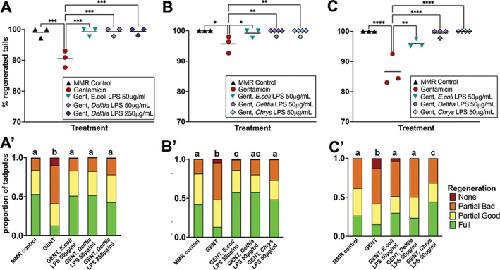 Figure 5. LPS from an exogenous Delftia spp. rescues regeneration in stage 46 tadpoles raised in the antibiotic gentamicin (gent). Timeline of treatments as for Figure 4A. (AâC) represent data from three sibships of tadpoles. Each point represents the percentage of tadpoles regenerating any tissue at all, is the sum of full, partial good and partial bad tadpoles and is a replicate Petri dish with sample size of 32-65 (A), 23-60 (B) or 40-65 tadpoles per dish (C). One-way ANOVA with Tukey post hoc comparisons of all means. *p < .05, **p < .01, ***p < .001, ****p < .0001. (A0â C0) are stacked categorical graphs of the same tadpoles, showing the proportion of each phenotype by dish. Compact letter display has been used to indicate statistical significance; each treatment is assigned a letter, with treatments within the same letter group having no statistically significant difference from each other. Extended CochranâArmitage test, followed by post hoc pairwise ordinal independence test with BenjaminiâHochberg correction. Raw data can be found in the Supporting information S1 [Color figure can be viewed at wileyonlinelibrary.com]