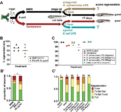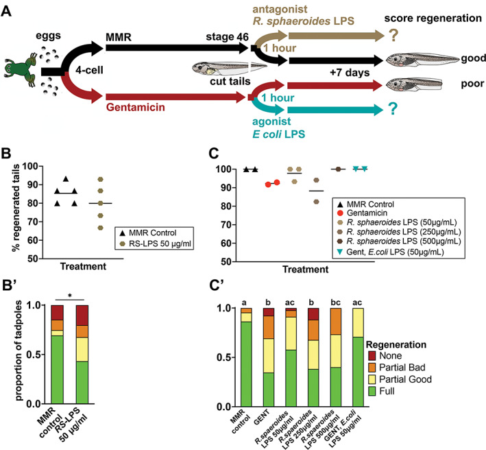 Figure 6. Rhodobacter sphaeroides LPS, a TLR4 antagonist, can significantly reduce regeneration quality, but not quantity. (A) Timeline of treatments. Exposure of the cut tail stump to agonistic LPS should enhance regeneration in antibiotic-raised tadpoles, as in Figures 2â4, and antagonistic LPS (RS-LPS) is expected to reduce regeneration in naturally raised tadpoles. (B and C) Scatterplots where each point represents the percentage of tadpoles regenerating any tissue at all, is the sum of full, partial good and partial bad tadpoles and is a replicate Petri dish with sample size of N = 15 (B) or 11-17 tadpoles per dish (C). (B) 50 μg/ml ultrapure RS-LPS (Invivogen) treatment versus controls. Unpaired t-test showed no significant difference between groups. (C) Post-amputation treatment with three concentrations of antagonistic-extracted RS-LPS was compared to control tadpoles and gentamicin-treated tadpoles with or without E. coli LPS rescue. One-way ANOVA with Tukey post hoc comparisons of all means showed no significant differences between groups. (B0 and C0) are stacked categorical graphs of the same tadpoles, showing the proportion of each phenotype by dish. Compact letter display has been used to indicate statistical significance; each treatment is assigned a letter, with treatments within the same letter group having no statistically significant difference from each other. Extended Cochranâ Armitage test, followed by post hoc pairwise ordinal independence test with BenjaminiâHochberg correction. *p < .05. Raw data can be found in the Supporting information S1 [Color figure can be viewed at wileyonlinelibrary.com]