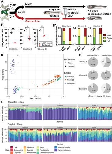 FIGURE 1. The tadpole tail skin microbiome varies between sibships and can be altered dramatically by raising tadpoles in antibiotics. (A) Schematic of the experimental design. Three sibships of 4‐cell embryos were randomly assigned to gentamicin‐treated and control groups. Tail samples for microbiome analysis were obtained at stage 46 from two replicate cohorts of 24 tadpoles for each treatment and sibship. Tadpoles were scored for regeneration 7 days after tail amputation. (B) Regeneration data from three tadpole sibships. Each point represents the percentage of tadpoles regenerating any tissue at all, is the sum of full, partial good and partial bad tadpoles and is a replicate Petri dish with sample size of 24 tadpoles per dish, with the exception of controls for Sibship B where N = 22 as two died in each before they could be scored for regeneration. Unpaired t‐tests, *p < .05, **p < .01. (B′) Stacked categorical graphs comparing regeneration phenotypes for each sibship. Linear‐by‐Linear association test, ****p < .0001. (C) Principal coordinates analysis (PCoA) ordination plot of tadpole tail samples with >1500 reads, calculated based on Bray–Curtis distance. (D) Pie charts showing the percentage of Gram‐negative versus Gram‐positive annotated reads for each sibship when raised with or without gentamicin. (E) Relative abundance of the 10 most abundant bacterial classes in tadpole tail skin, stratified by sibship and treatment status. Raw data can be found in Supporting information S1