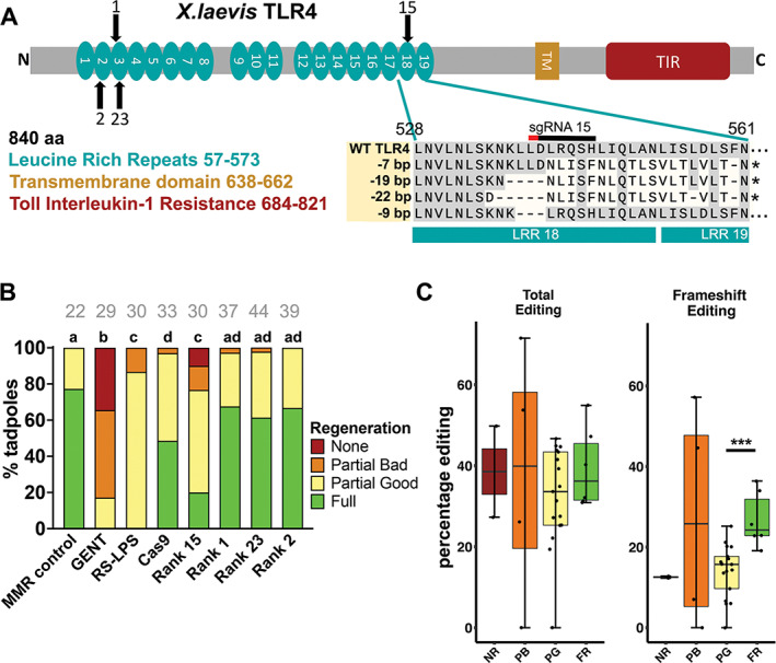 Black arrows show targets of sgRNA, numbers associated with arrows indicate the specific sgRNA. The most common deletions generated by sgRNA rank 15 result in a + 1 frameshift which leads to a stop codon that truncates the protein mid‐19th LRR domain. A less commonly occurring −9 bp deletion results in the loss of three amino acids from LRR 18. (B) Stacked categorical graphs of tadpole regeneration, showing the proportion of each phenotype by treatment. MMR controls are unmanipulated embryos, gentamicin is embryos raised in 50 μg/ml gentamicin from 4 cell stage to 1 day post amputation. No other embryos in this set were raised in antibiotics. RS‐LPS is R. sphaeroides LPS, a natural TLR4 antagonist. Four different sgRNA were used, average editing for eight randomly chosen stage 10 embryos was 74% for sgRNA rank 15 and <10% for the other sgRNA. Tadpoles at stage 46 had the posterior third of the tail removed using a scalpel blade and were scored for regeneration quality a week later. Compact letter display has been used to indicate statistical significance; each treatment is assigned a letter, with treatments within the same letter group having no statistically significant difference from each other. Grey numbers above bars indicate sample size (N). Extended Cochran–Armitage test, followed by post hoc pairwise ordinal independence test with Benjamini–Hochberg correction. (C) Boxplot of total editing percentage (C) and frameshift editing percentage (C′) in tadpole tail clips from each regeneration category. Shapiro–Wilk test of normality, followed by unpaired t‐test (Editing) and Wilcoxon Rank Sum (Frameshift). FR, full regeneration; NR, no regeneration; PB, partial regeneration (Bad); PG, partial regeneration (Good). ***p < .001. Raw data can be found in the Supporting information S1