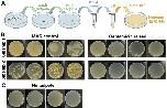 FIGURE 3. Raising tadpoles in 50 μg/ml gentamicin dramatically reduces the number of viable bacteria grown from tadpole skin. (A) Schematic of the method used to capture bacteria from single stage 47 tadpoles. After being raised in either MMR or gentamicin solution, a selected tadpole was washed twice in MMR and vortexed for 20 s in 100 μl NaCl/Tween20. Fifty microlitres of the solution was then added to 1 ml Luria Broth and two replicate plates spread. (B) Plates photographed after 66 h at 18°C. Two tadpoles from each sibship, raised ± gentamicin are shown. (C) Controls prepared as above but with no tadpole, to ensure no contamination from the environment