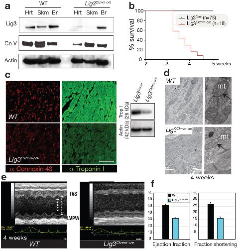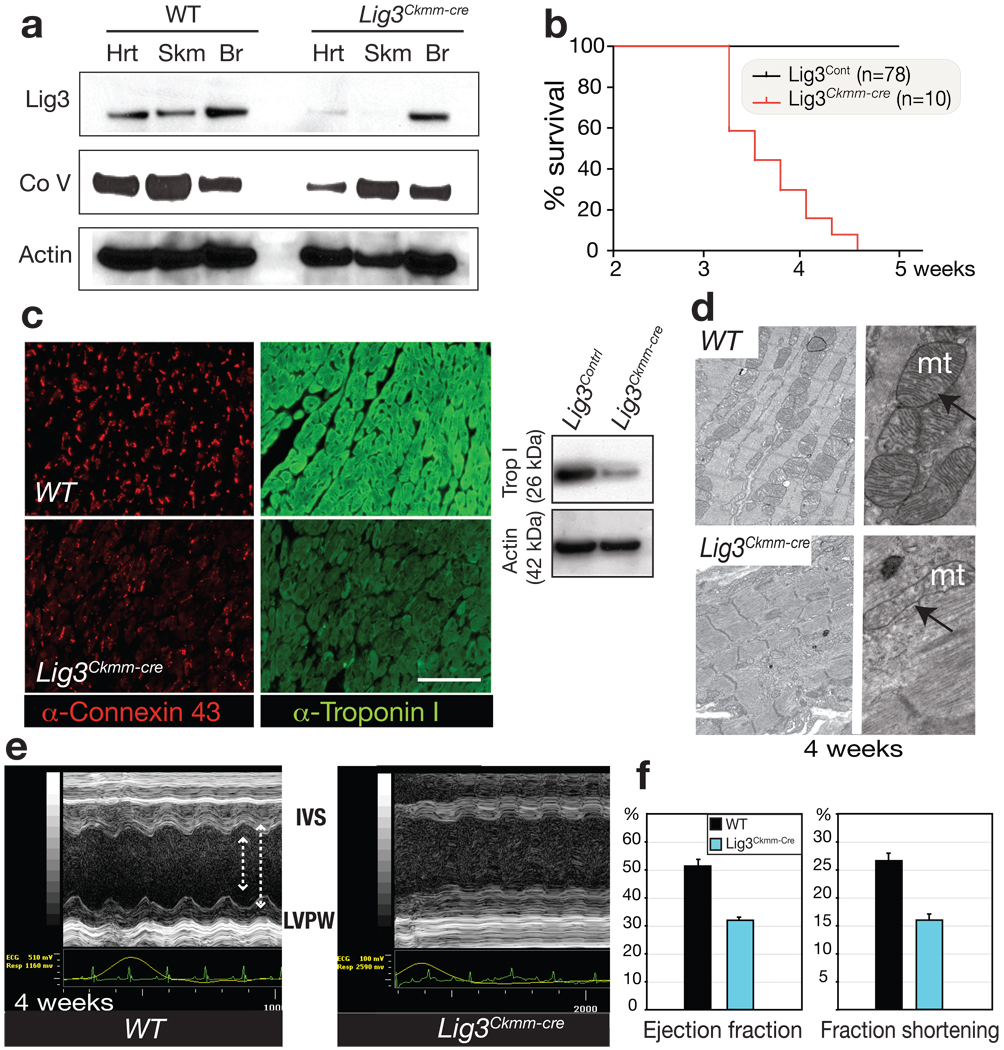 Figure 3. Lig3 inactivation causes cardiac failure associated with defective mitochondrial function(a) Lig3 protein levels are reduced in Lig3Ckmm-cre heart and skeletal muscle. A reduction of complex V subunit α also occurs in Lig3Ckmm-cre heart. (b) Lig3Ckmm-cre mice die between 3.5 and 4.5 weeks of age; n is the number of animals. (c) Altered connexin-43 distribution and depletion of cardiac troponin I occurs in 4-week-old Lig3Ckmm-cre heart. A Western blot shows decreased cardiac troponin I levels. (d) Electron microscopy of cardiac muscle shows disruption in myofiber structure and defects in mitochondrial morphology. (e) Echocardiographic analysis of Lig3Ckmm-cre mice shows movement of the interventricular septum (IVS) and the posterior walls of the left ventricle (LVPW) were decreased in the Lig3Ckmm-Cre heart (arrows). Traces below the echocardiogram show ECG readings indicate abnormal heart rhythm. (f) Cardiac contractility was also significantly depressed with decreased ejection fraction and fraction shortening indicating that the pump function of the Lig3Ckmm-Cre heart is defective. Three individual animals of each genotype were used; error bars represent standard deviation.