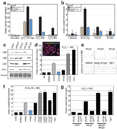 Figure 4. Lig3 is not essential for nuclear DNA repair(a) Alkaline comet analysis shows DNA strand break repair after hydrogen peroxide treatment is similar between WT and Lig3Nes-cre quiescent primary astrocytes, but is defective in Xrcc1Nes-cre cells, as is repair after ionizing radiation (b); R30/R60 is recovery from the genotoxin after 30 or 60 minutes. Assays were run in triplicate from at least three separate experiments; error bars in all panels represent standard error of the mean. (c) Western blot analysis indicates specific shRNA-mediated knockdown of mammalian DNA ligases. Non-target scrambled (Scr) and Nbs1 shRNAs were included as controls, and Ponceau staining indicates relative protein transfer. (d) Lig1 is required for DNA repair after H2O2 damage; dual inactivation of Lig1 and Lig3 reveals cooperation between these ligases during repair. Tdp1−/− MEFS are a repair-deficient control. Photograph indicates cells are quiescent based on p27+ and PCNA− immunoreactivity. (e) Representative individual comet tail moments of shRNA-mediated knockdowns after H2O2 treatment. (f) Lig1 and Lig4 are required for DNA repair after IR. Lig1 and Lig3 cooperate in the repair of IR-induced DNA damage. (g) DNA repair competency after H2O2 treatment is restored using a shLig1-resistant version of Lig1 cDNA (Lig1shR).