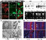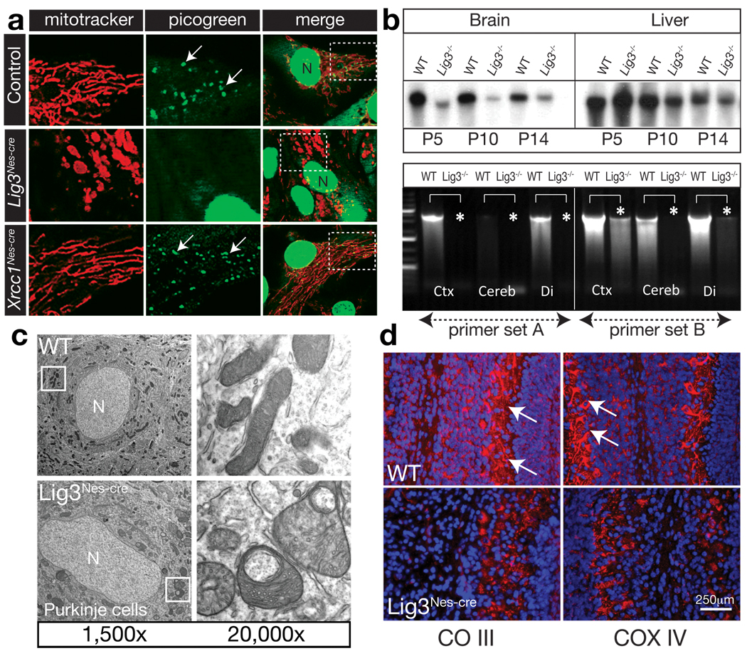 Figure 2. Mitochondrial function is disrupted in the Lig3Nes-cre brain(a) Mitotracker labeling reveals defects in mitochondria from Lig3Nes-cre but not WT or Xrcc1Nes-cre astrocytes. Picogreen staining shows reduced mtDNA in Lig3Nes-cre astrocytes; N is the nucleus. Boxed areas show the region expanded in adjacent panels. (b) Analysis of mtDNA via pulse field gel electrophoresis shows an age-dependent quantitative reduction in mtDNA from P5-P14 Lig3Nes-cre brain compared with controls. mtDNA levels in the Lig3Nes-cre liver were similar to control tissue. PCR of mtDNA revealed a reduction in mtDNA isolated from Lig3Nes-cre brain tissue (asterisks). Ctx is cortex, Cereb is cerebellum and Di is diencephalon. (c) Electron microscopy showed alterations in mitochondrial morphology in Lig3-deficient Purkinje cells compared to WT tissue. (d) Electron transport chain components complex III core 2 (CO III) and COX IV staining in vivo is reduced in P7 cerebellar Purkinje cell mitochondria; counterstain is DAPI.